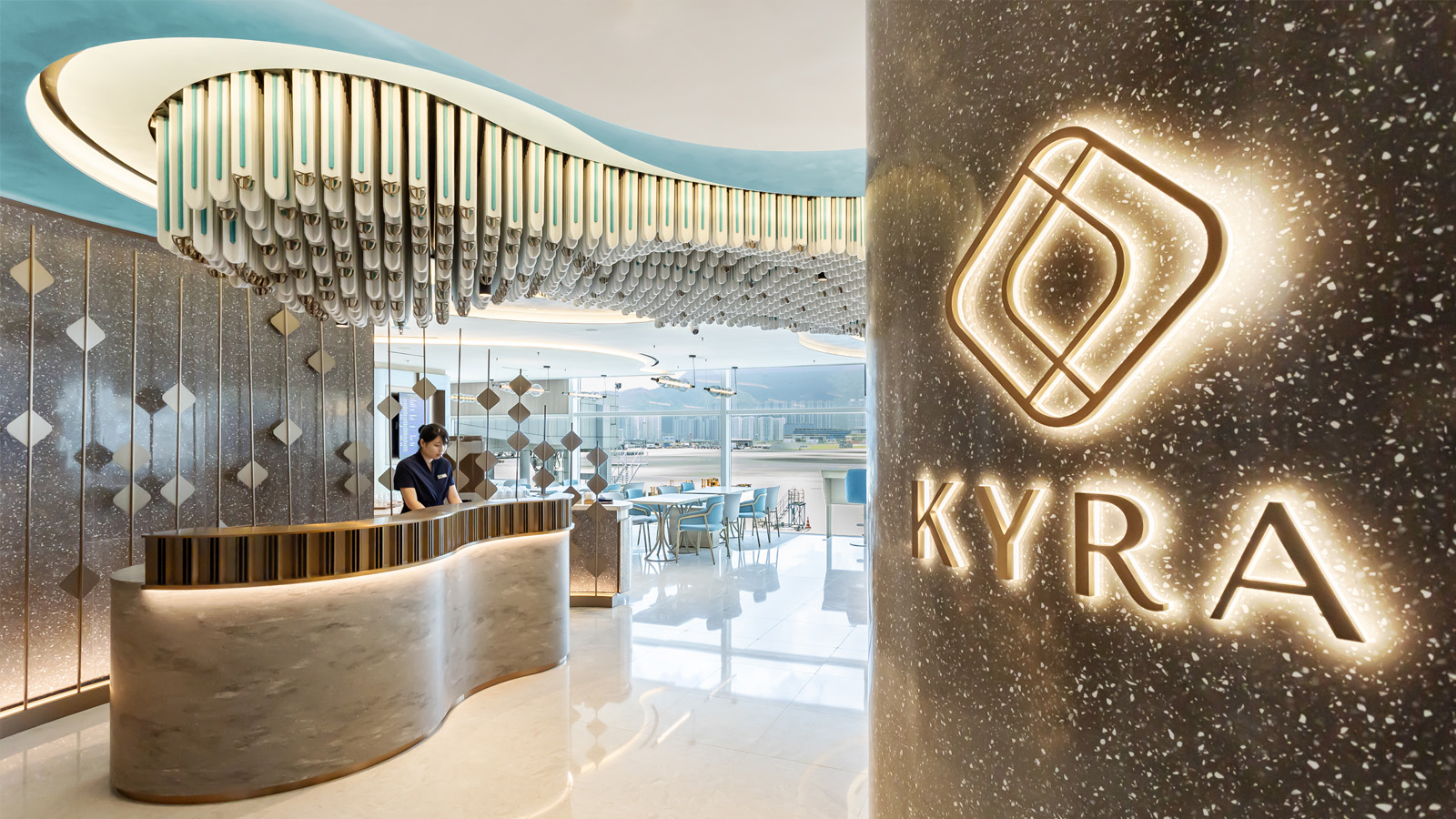 At Hong Kong International Airport, Kyra Lounge is an elegant space with quality dining and a calm, modern design, providing a welcome escape during busy transit periods.