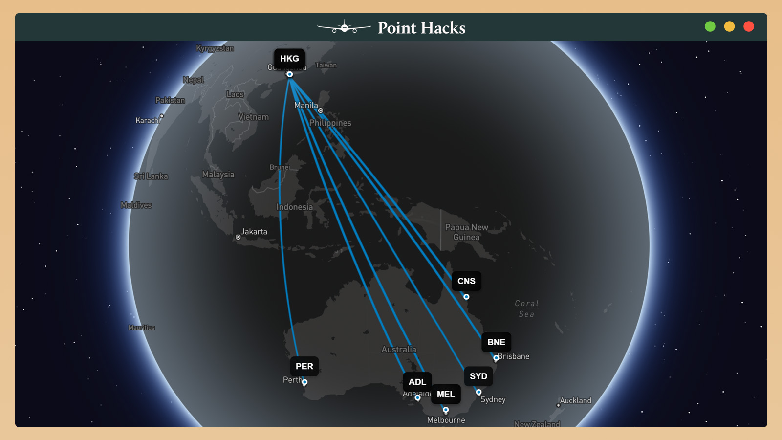 Cathay Pacific has an ever-increasing network of flights between Australia and Hong Kong. A Business Class seat on any of these flights costs just 58,000 Asia Miles + fees and taxes. From Perth, Cairns and Brisbane, you can even tack on a connection to Taipei in Business for no extra cost in miles!