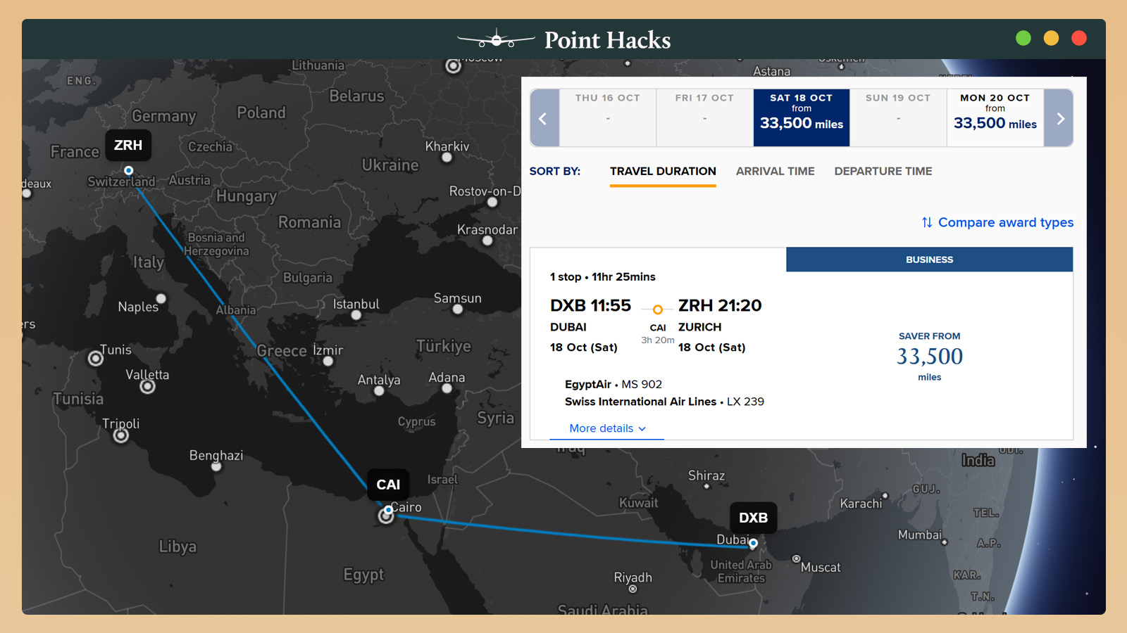 A similar sweet spot is flying anywhere from the Middle East to Europe on any Star Alliance carrier. Priced at 67,000 miles KrisFlyer miles return, it means a one-way journey is only 33,500 KrisFlyer miles. There are countless examples to choose from, but here’s an interesting one from Dubai to Zurich via Cairo on EgyptAir and Swiss.