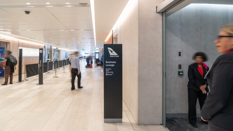 We step inside Qantas' temporary Sydney International Business Lounge near Gate 24, ahead of the airline building an all-new space to open in early 2027.