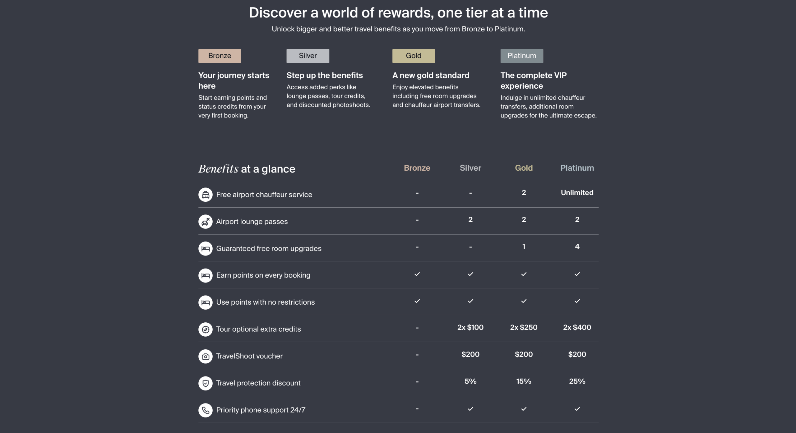 Starting from Bronze status, you can climb up to Silver, Gold and Platinum, with the benefits for each status level shown below.