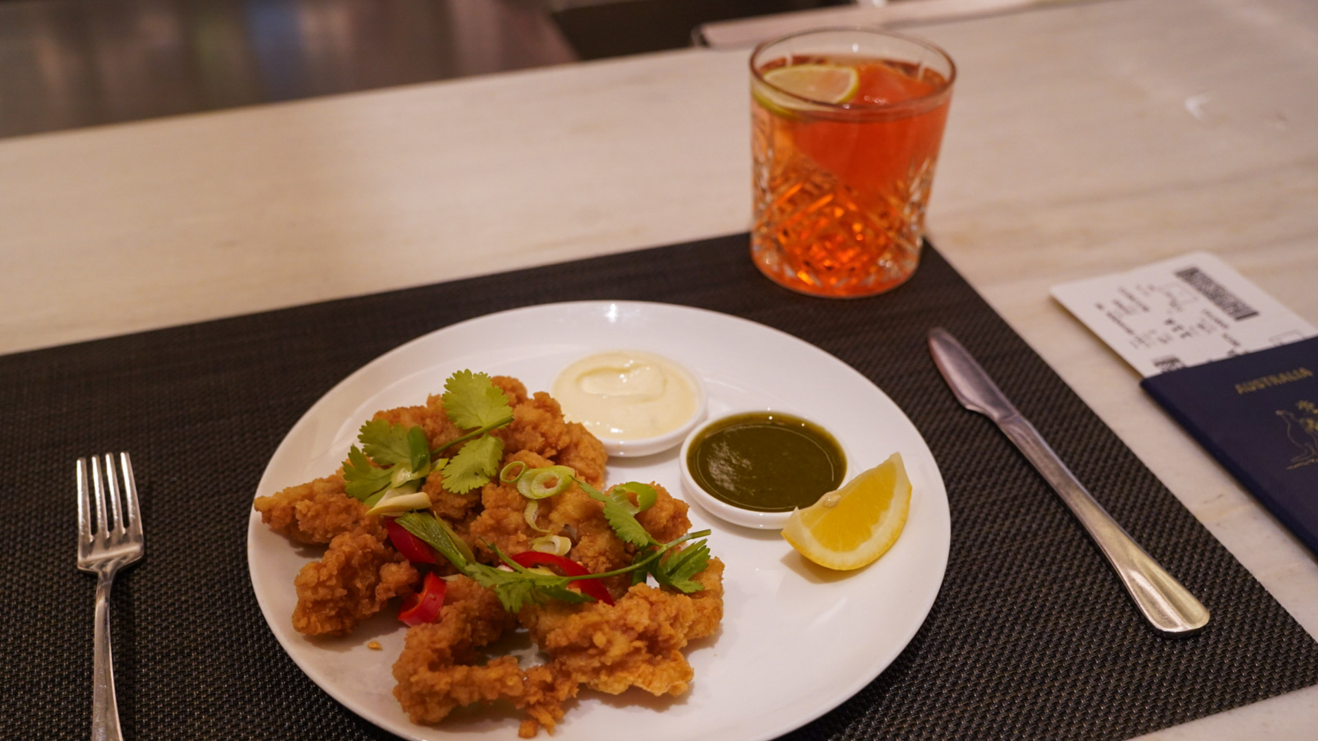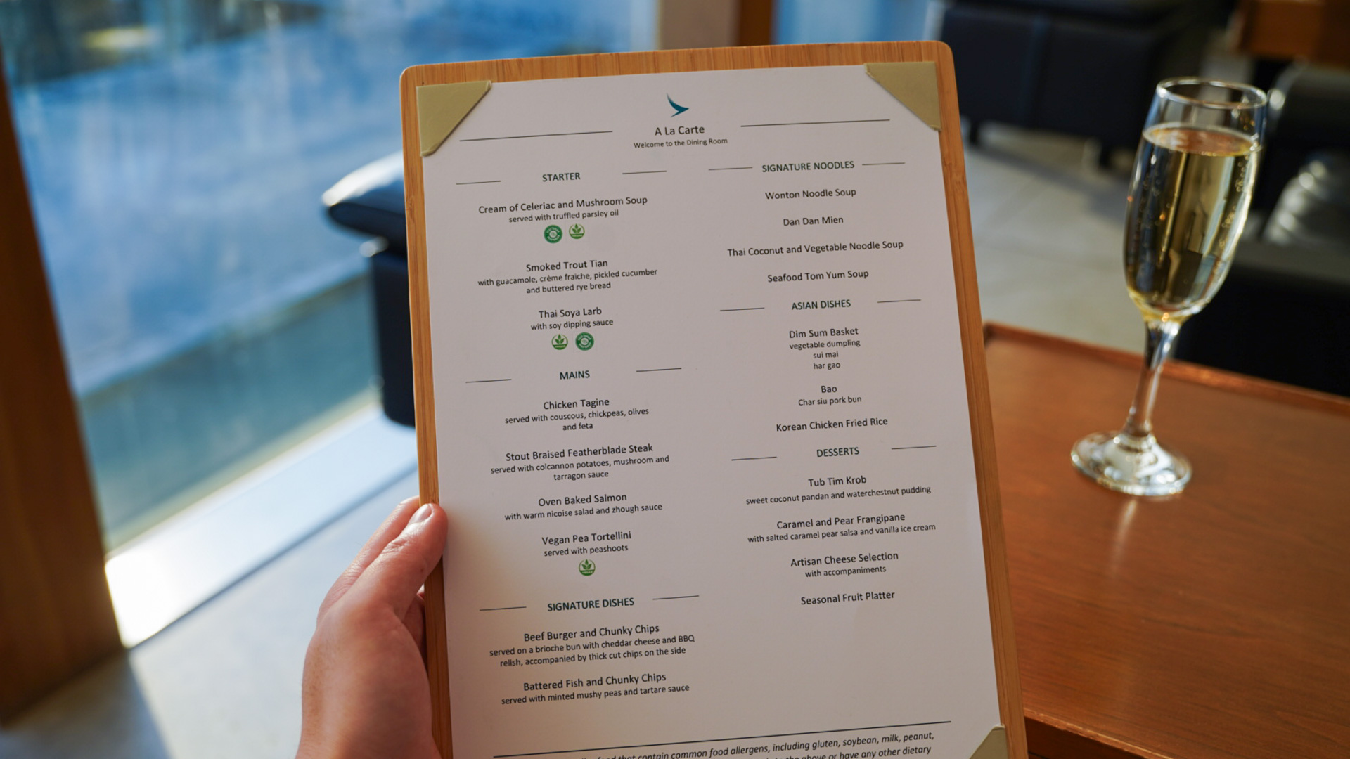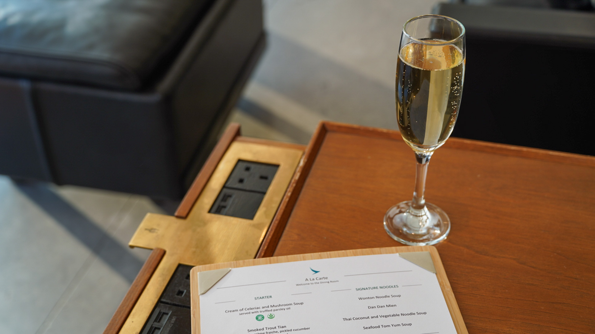 The dining is a step above the Business Class Noodle Bar, with table service and thoughtfully plated dishes. Seating is more spacious and refined, making it an excellent final stop before a long overnight flight.