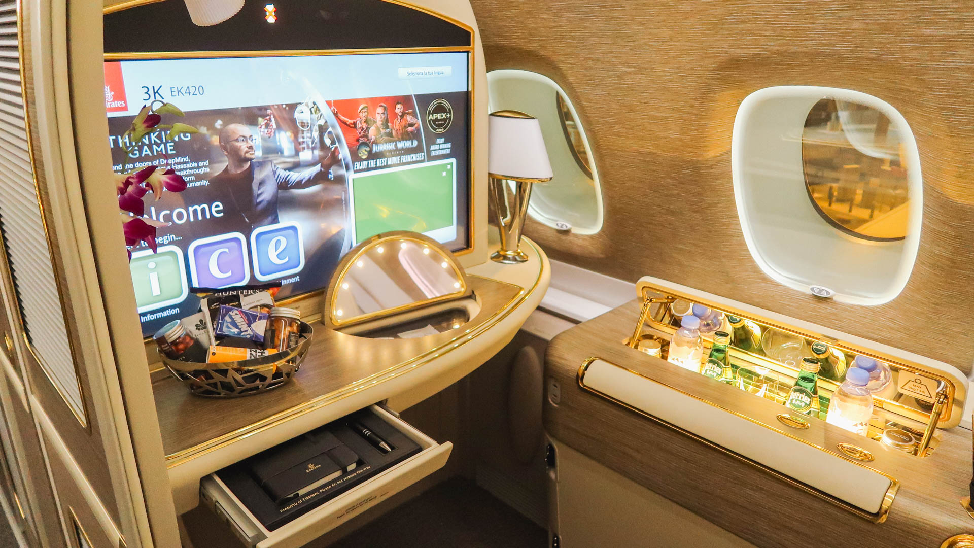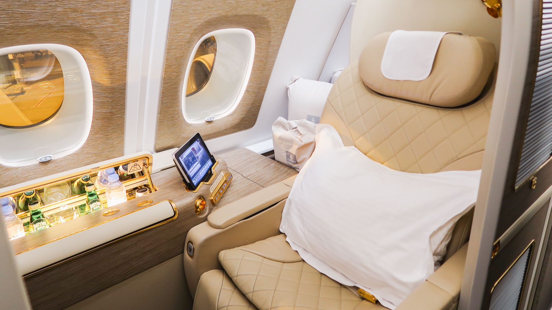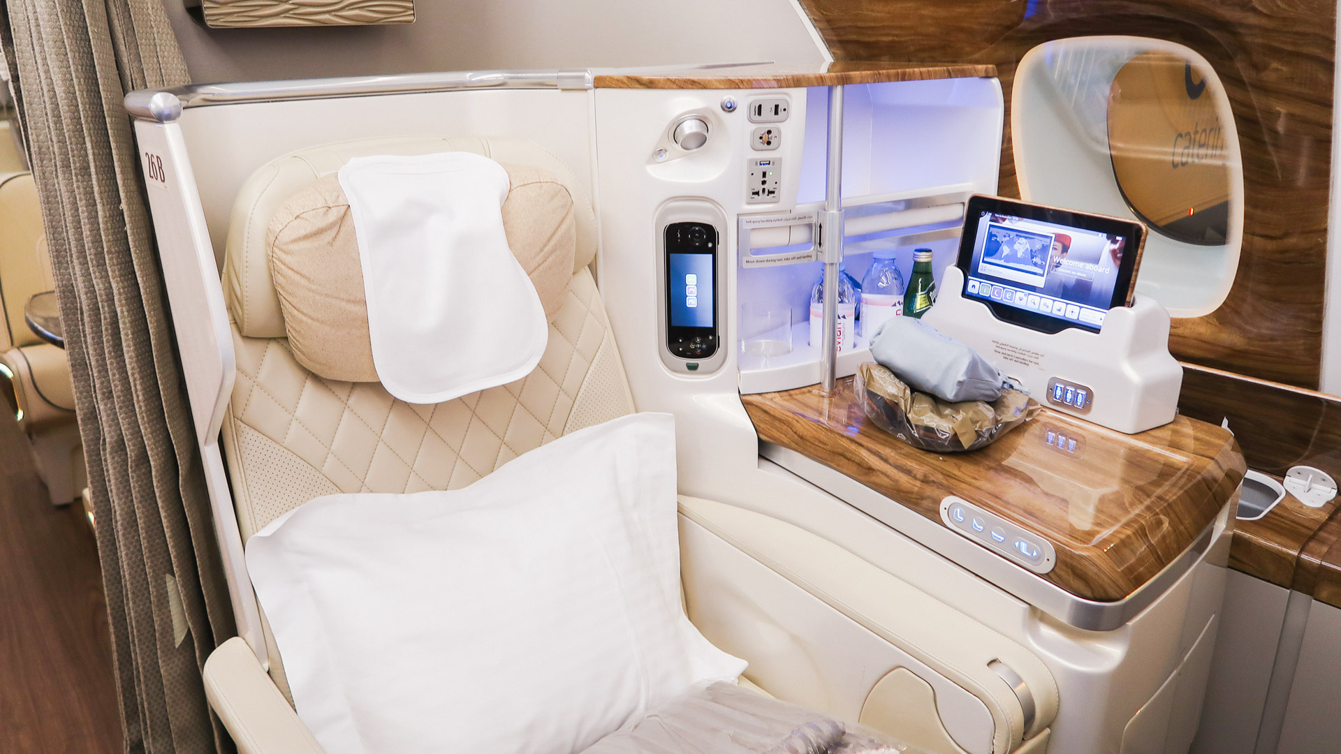 Emirates’ A380 First Class remains one of the most recognisable premium cabins in the sky. Expect fully private suites with closing doors, an opulent aesthetic, and the flagship onboard perks, such as the onboard shower.