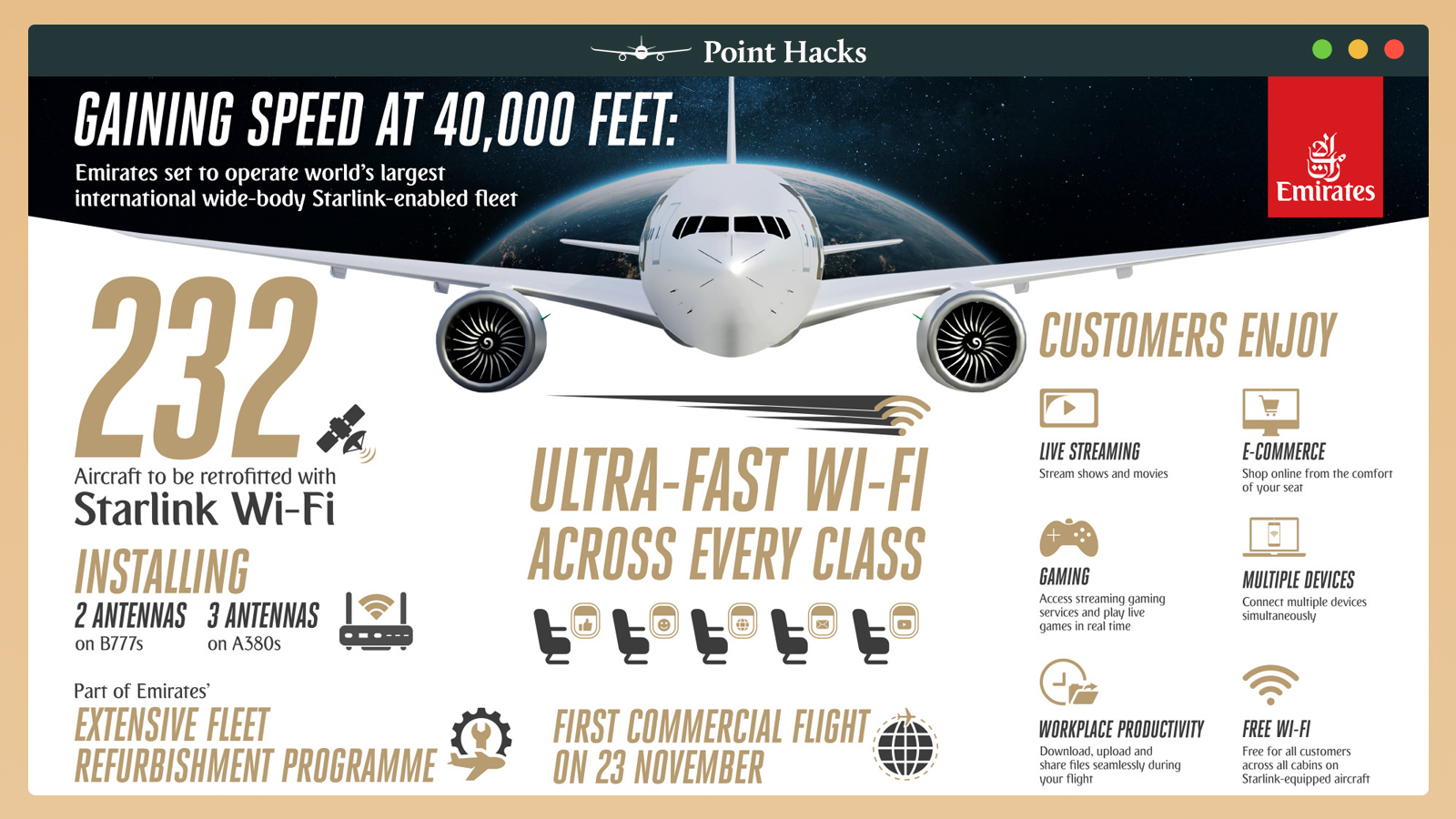 Having recently flown Qatar Airways’ Starlink-equipped service, it’s hard to settle for anything less. There are no log-in screens, paywalls or tiered access – just instant, high-speed connectivity for every passenger, regardless of cabin or frequent flyer status. That’s the benchmark Emirates is now working toward.