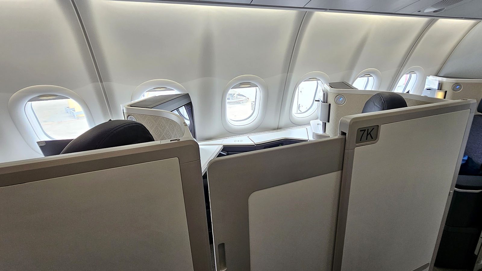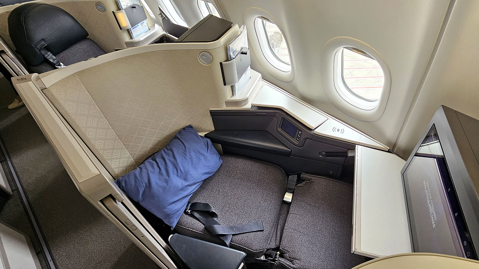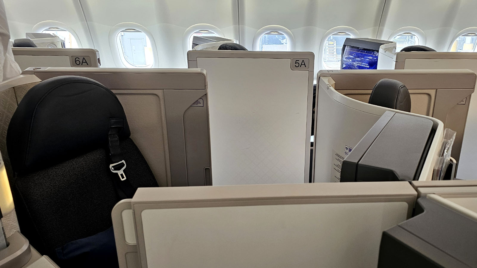 But beyond that, each seat offers a privacy door. If the seat looks familiar, that’s because it’s the Collins Aerospace Super Diamond seat, with the optional door included. If you’ve flown Club Suite on British Airways, it’s the same product – just in different colours and with branding tweaks. It’s also much like the seat you’ll find on Air Canada between Australia and Vancouver – albeit Air Canada’s seat being without the door.