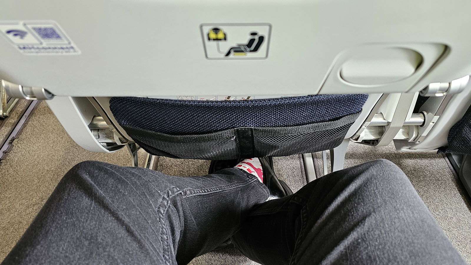 This design features a carveout at knee height, giving more room to move. Even when the seat in front fully reclines, my knees are still free. That’s because the recline motion slides the base of the seat forward, thereby avoiding a collision with the traveller behind you.