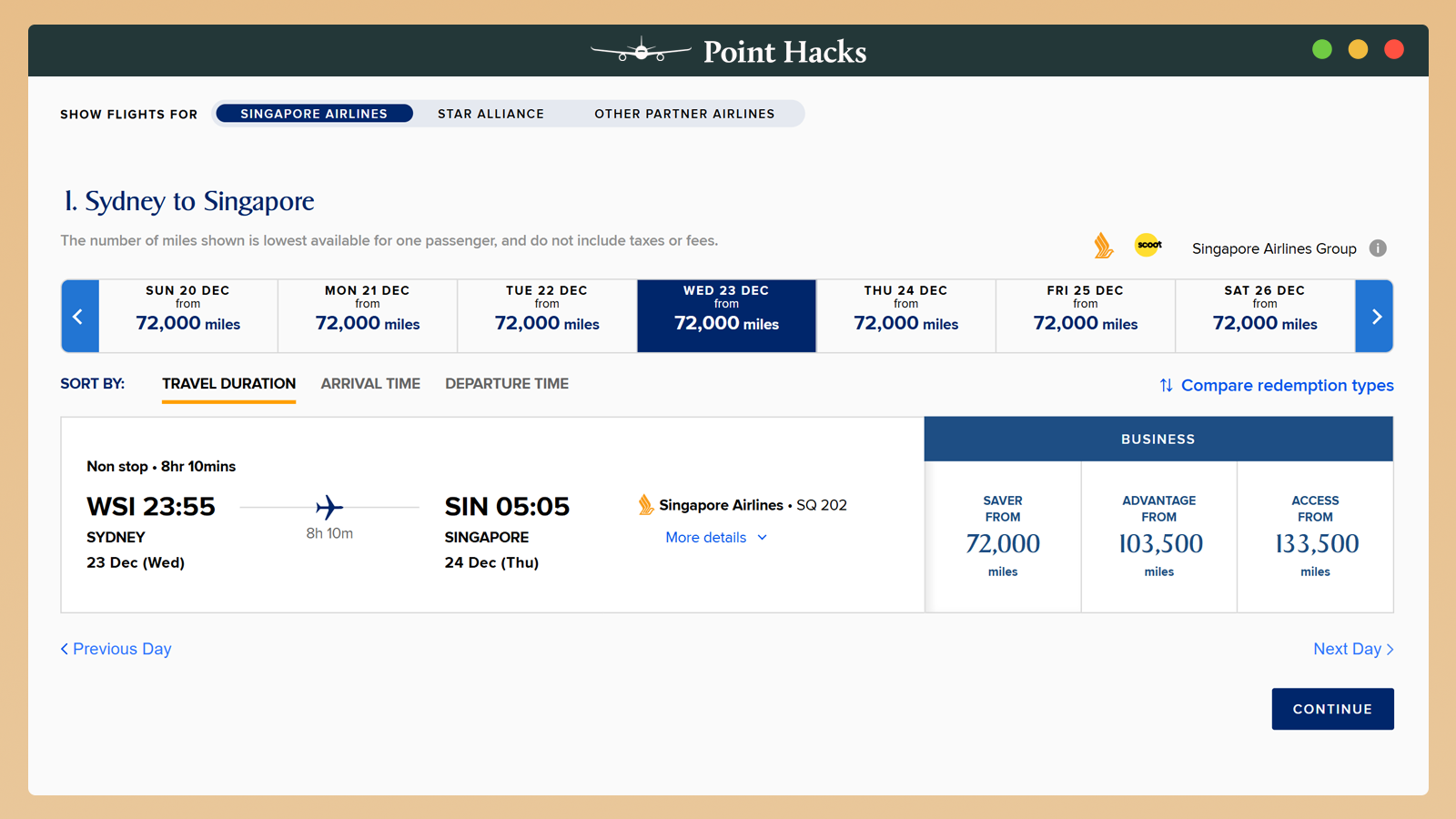 - Business Class: From 72,000 KrisFlyer miles + A$111.71 one-way