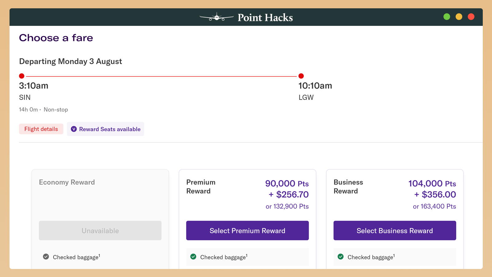 A one-way Business Class reward seat from Singapore to London-Gatwick costs 104,000 Velocity Points plus A$356 per person. Coming back is more expensive due to higher airport charges and the UK’s Air Passenger Duty. Expect to pay 104,000 points + A$806 per person on the way back.