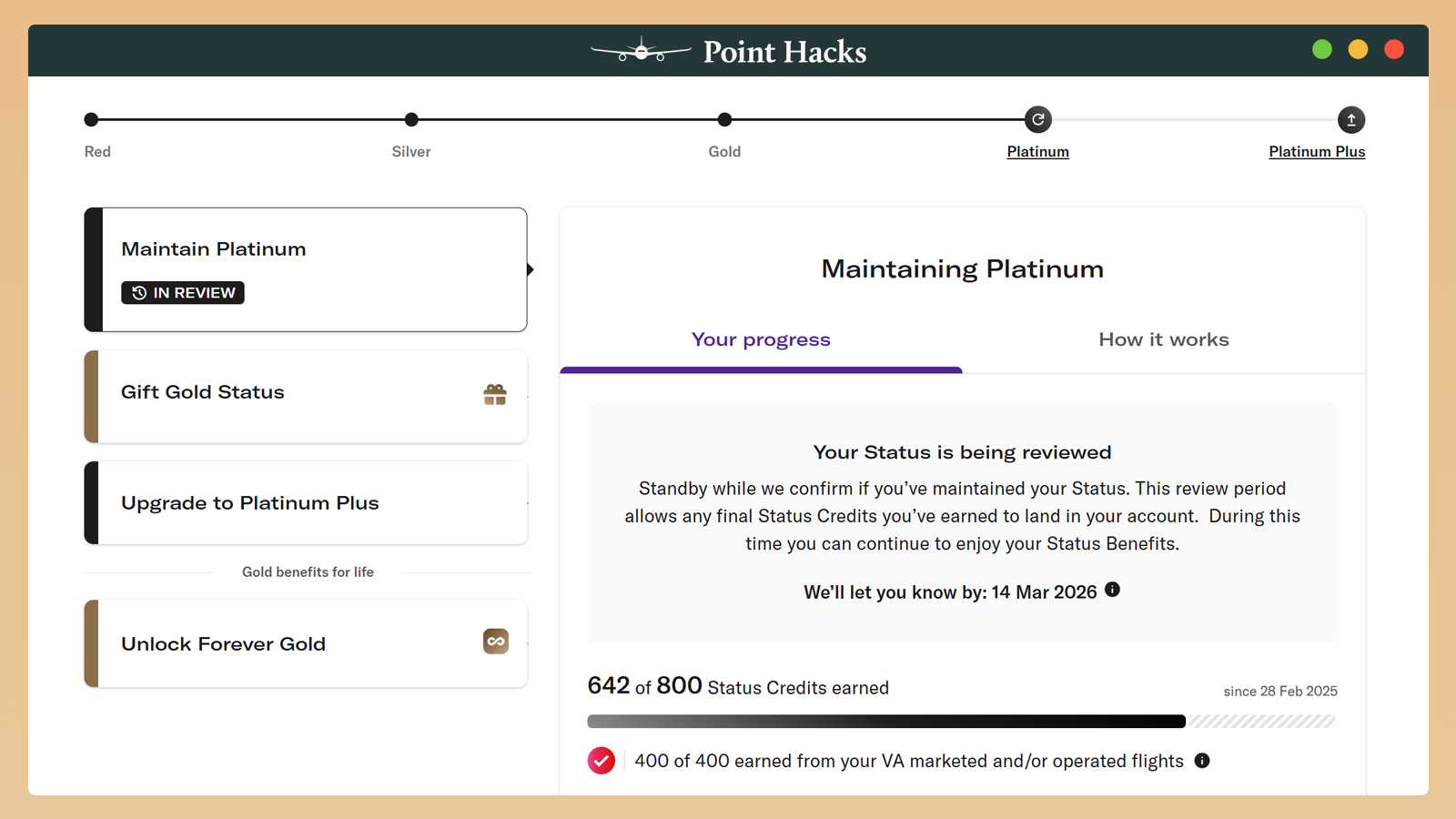 I’ve also re-earned Platinum status with Qantas, which grants me perks in the oneworld ecosystem. But Virgin Australia domestic flights tend to be cheaper than Qantas, so I usually end up flying a mix of both carriers. Having Platinum with both programs is appealing…