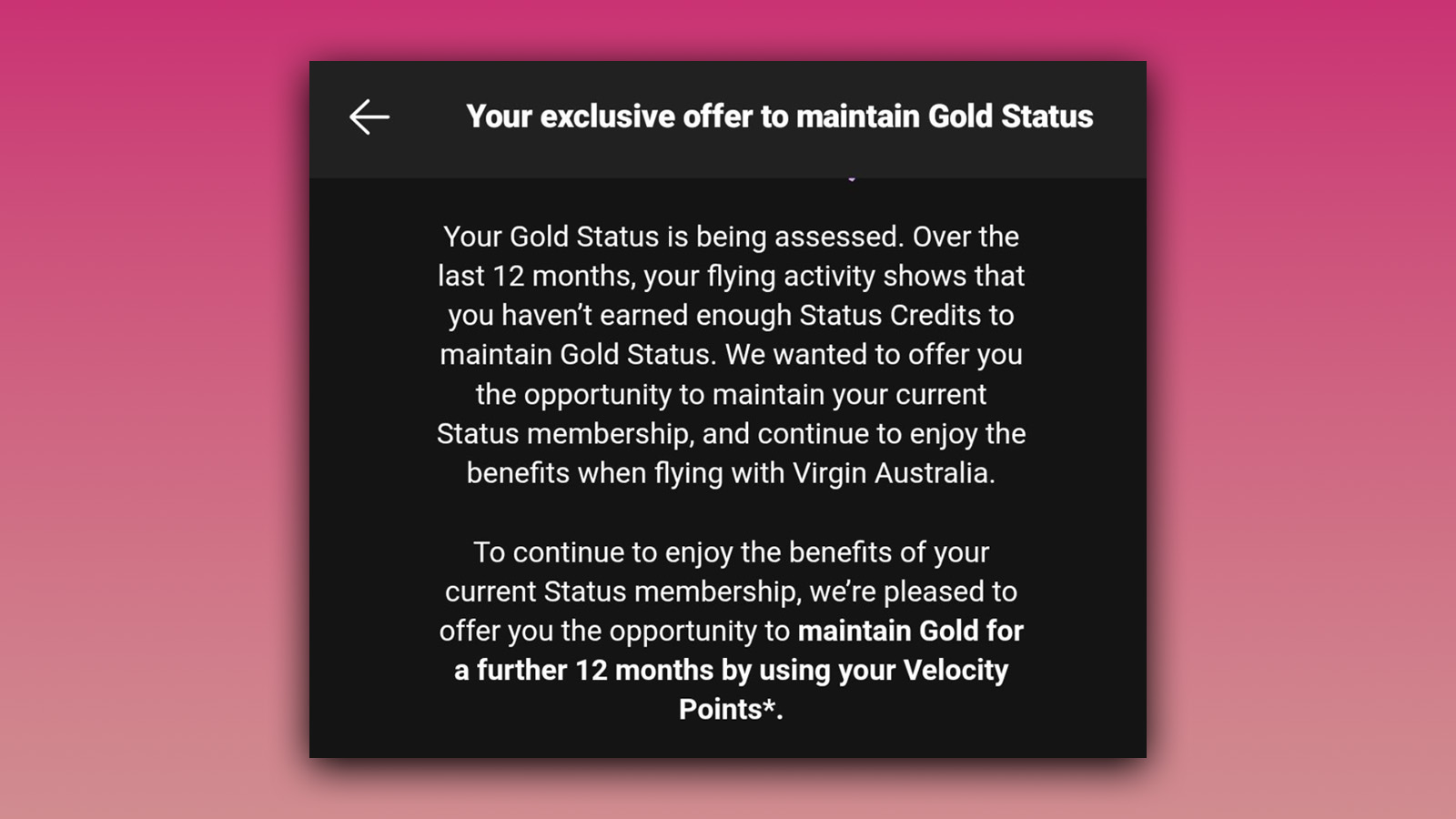 Virgin Australia’s loyalty program has begun offering targeted status retention offers, allowing members to maintain their tier for another year by redeeming Velocity Points. Though it’s still early days, it appears this offer is valid during the two-week ‘review period’ that kicks in at the end of a membership year.