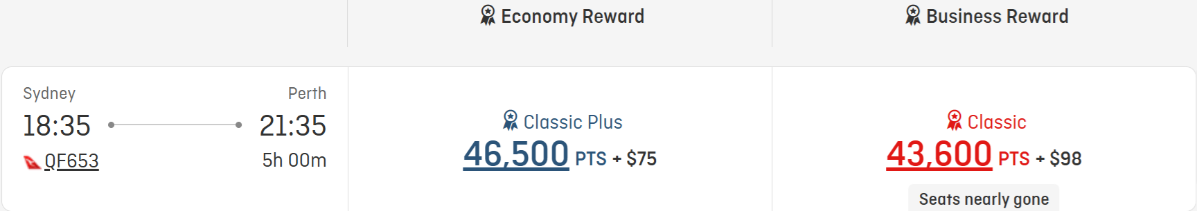 Let’s say you’re planning a Business Class jaunt from Sydney to Perth. When booked through Qantas Frequent Flyer, you’d need 43,600 Qantas Points + $98 in taxes, fees and charges for a Classic Reward seat.