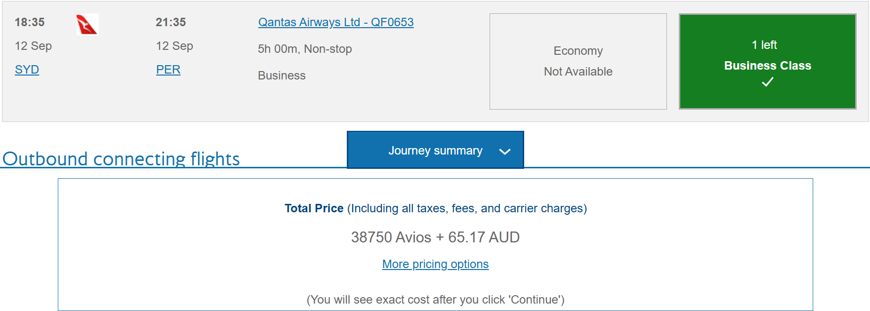 But what if you had Avios to spend through The British Airways Club? The same seat on the same flight costs even less, requiring 38,750 Avios plus $65.17. This is what we mean by being able to book Qantas using flexible credit card points, rather than with Qantas Points directly.
