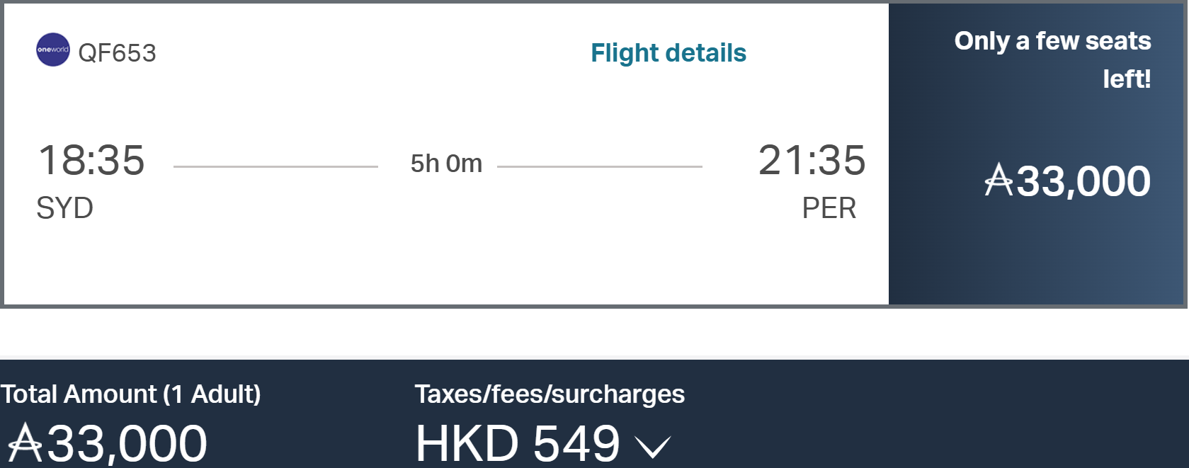Hmm, but what if you have access to Asia Miles with Cathay Pacific? That same flight would cost just 33,000 Asia Miles, plus $549 HKD (around $109 AUD). Sure, you’re paying around $11 more in fees and charges… but you’re also saving more than 10,000 frequent flyer points in the process. That’s by using Cathay rather than Qantas Frequent Flyer.