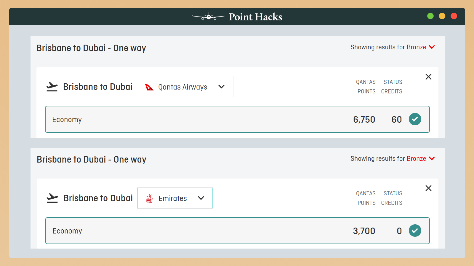 Let’s take the Emirates flight EK431 from Brisbane to Dubai. If I book this via the Emirates website, I can earn Qantas Points and, as a QF Gold member, access additional perks like priority check-in, boarding, baggage and Emirates lounge access. However, I will not earn Qantas Status Credits.