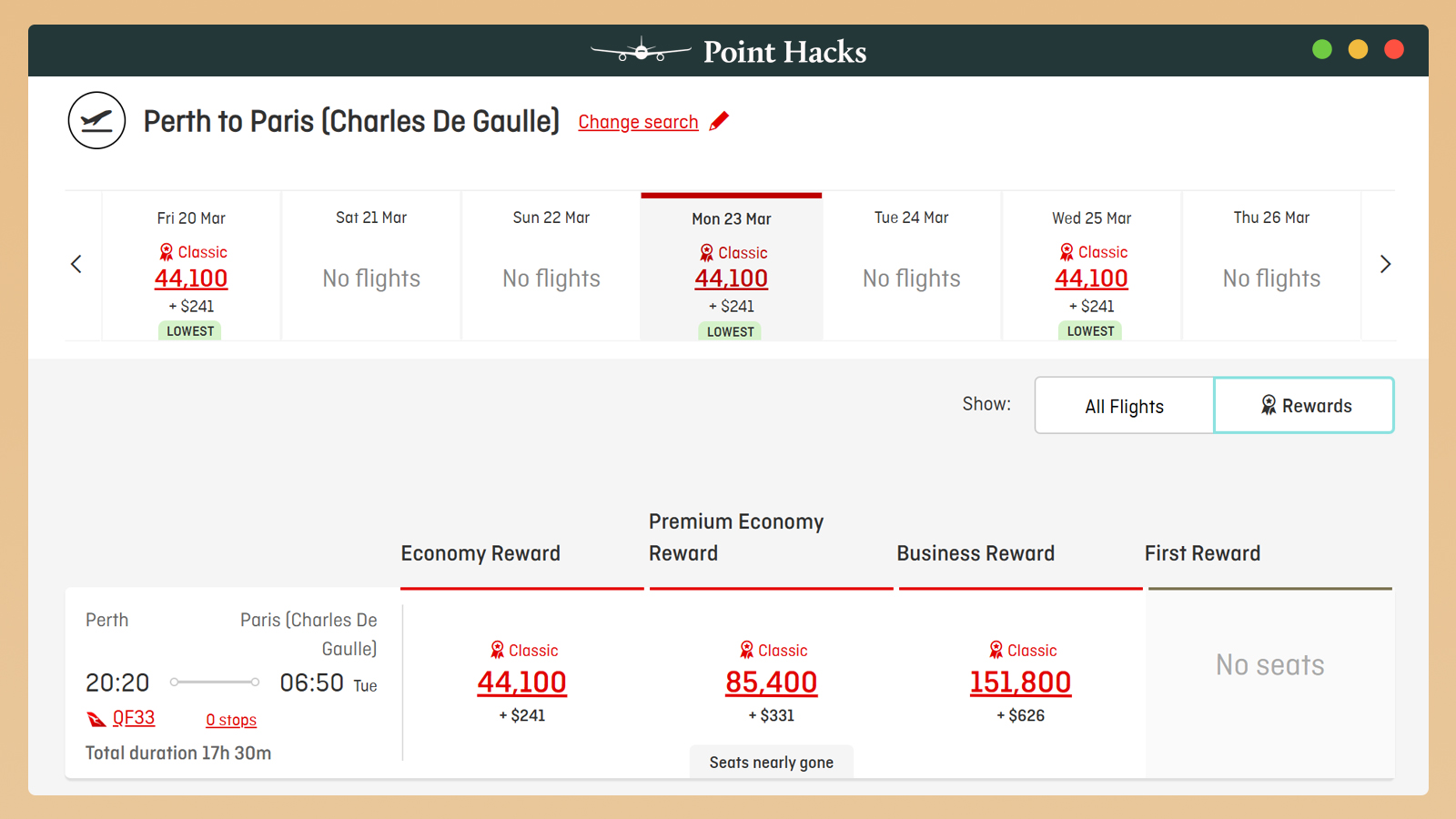 | Perth-Paris | 44,100 pts + $242 | 85,400 pts + $331 |