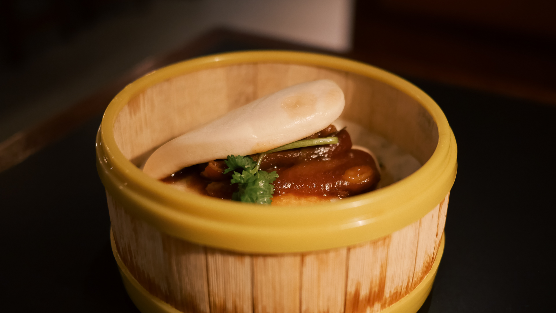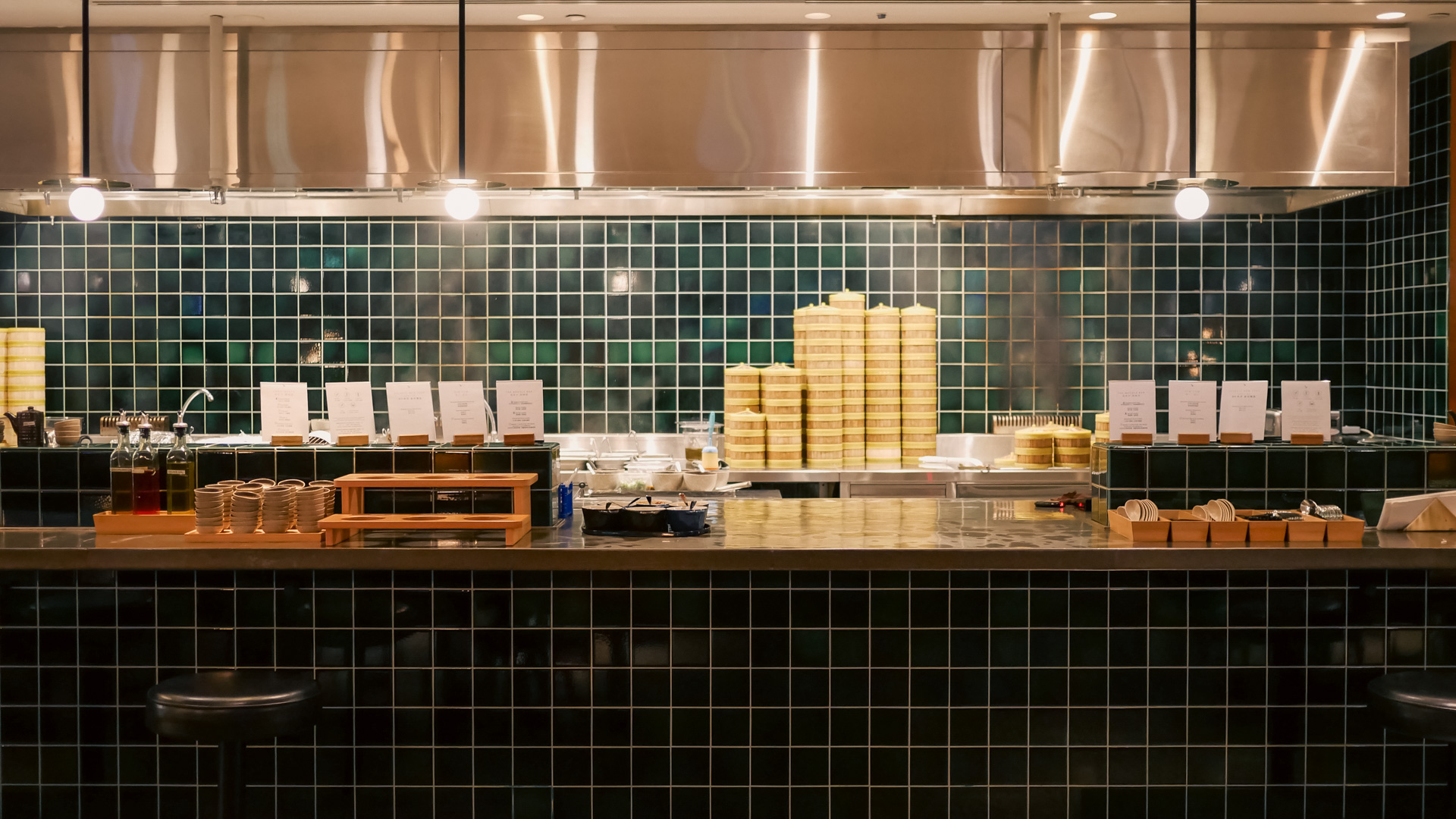 The Noodle Bar itself sits front and centre with bamboo baskets stacked up high and plumes of steam rising from the back.