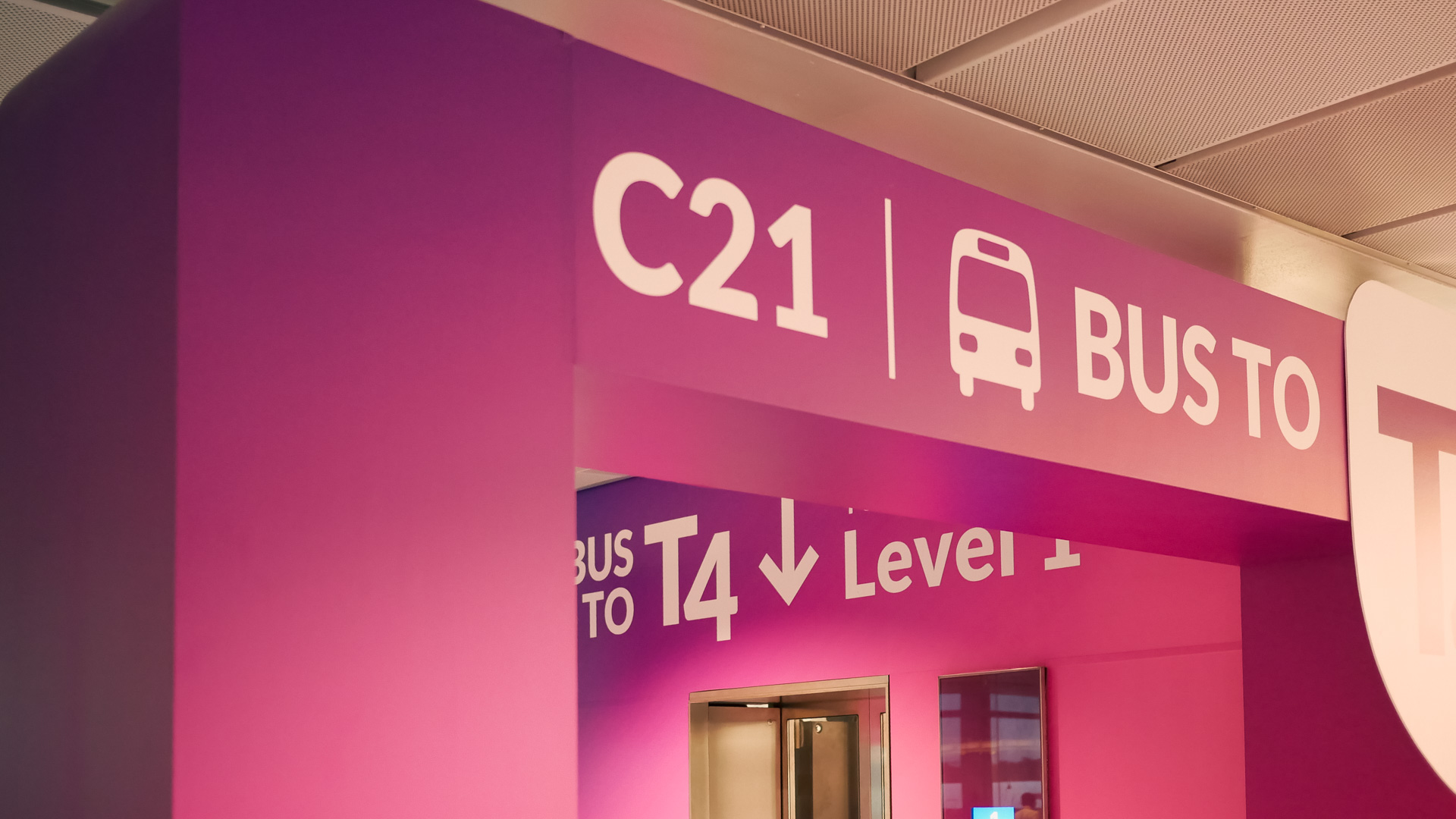 After clearing T1 immigration, head right and follow the signage to the T4 transit bus located next to Gate C21. Beneath the hard-to-miss pink archway with “Bus to T4” printed in bold, there’s a staff member checking boarding passes. I approach, cap in hand, and make my case… and she doesn’t bat an eyelid. We’re on.