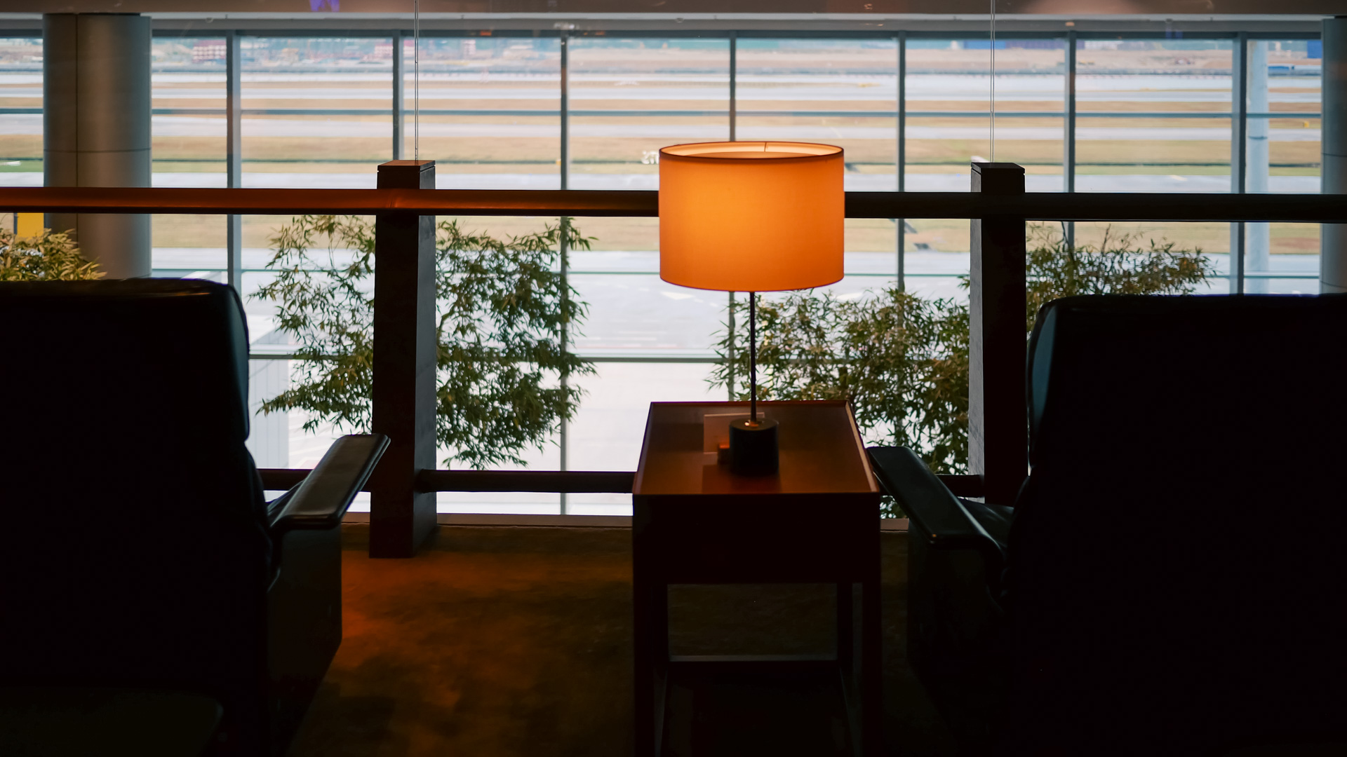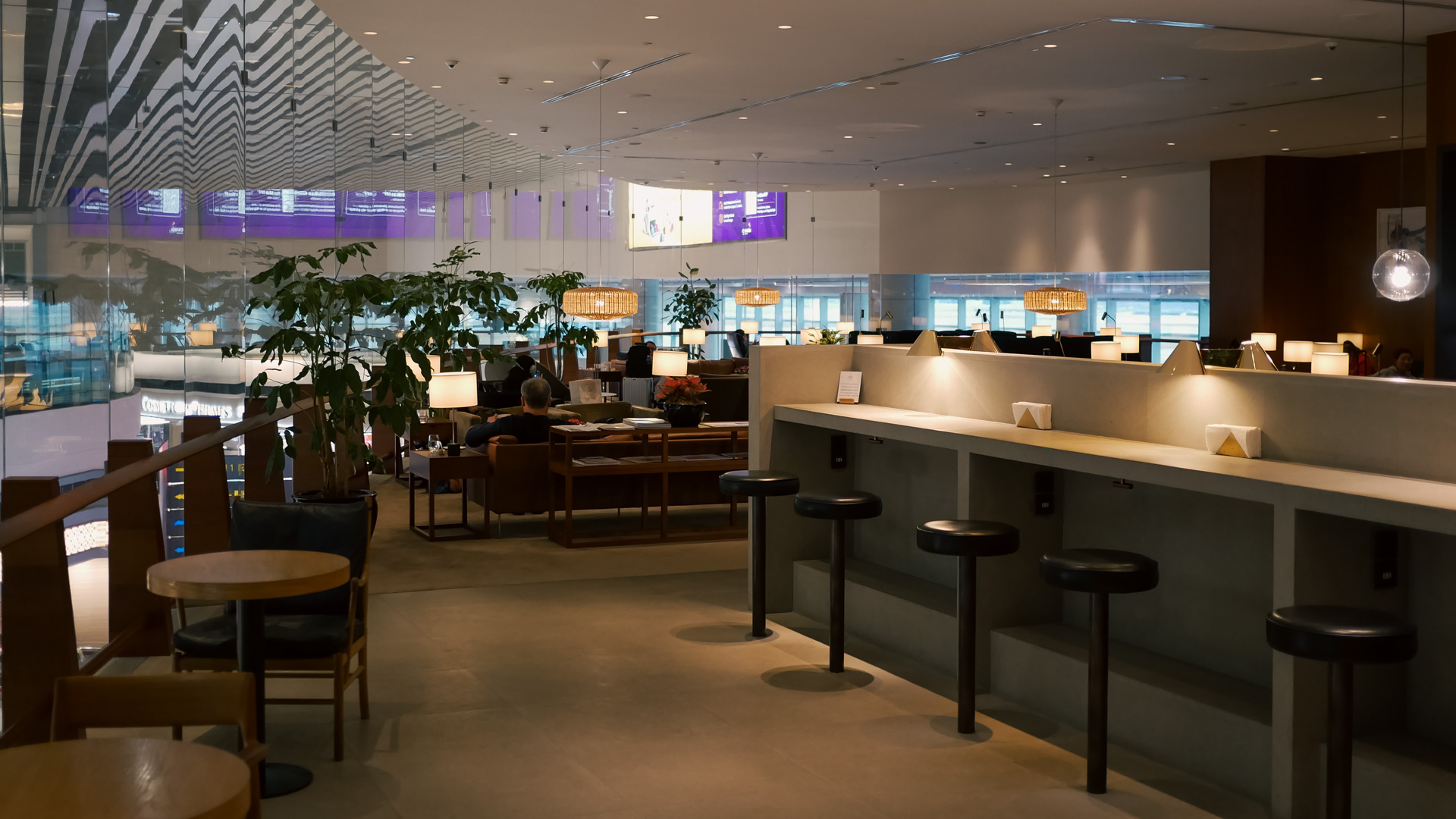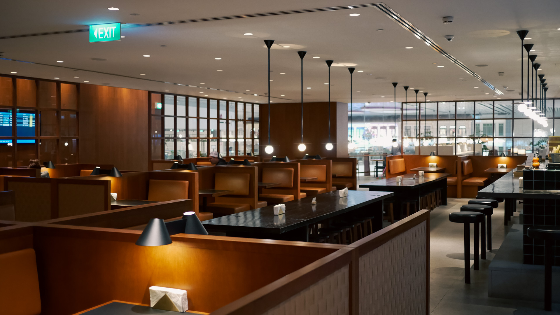 The Food Hall has towering glass windows looking down on the bustling terminal below, and as the layout snakes around, a few key seats get a front-row view of Runway 2.