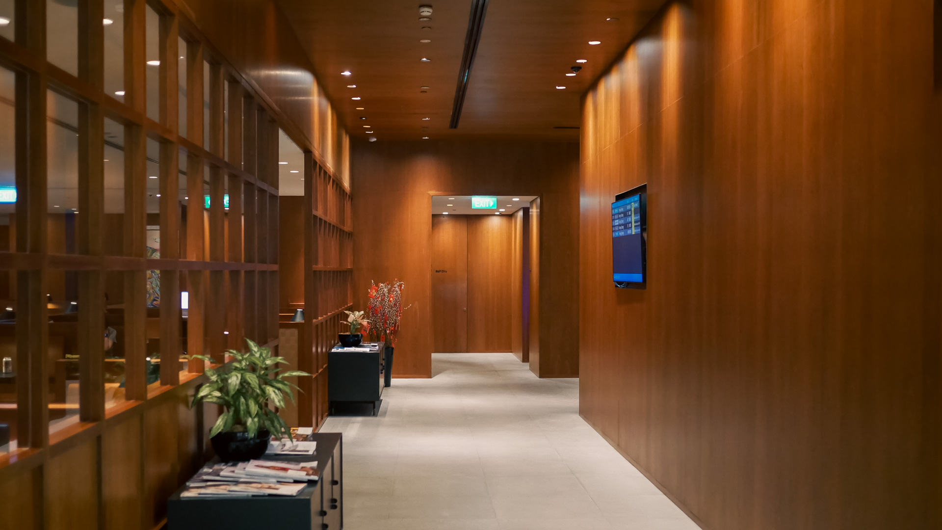 The Cathay Pacific Lounge immediately stands out with its unique, ceiling-high black entryway and dark wooden interior. Staff are admittedly quite confused when they see my T1 boarding pass. It takes two phone calls to the higher-ups and a quick double-check of the ‘oneworld welcome’ sign to confirm Qantas is actually a member, and nearly 40 minutes after starting my trek, I finally enter the lounge.