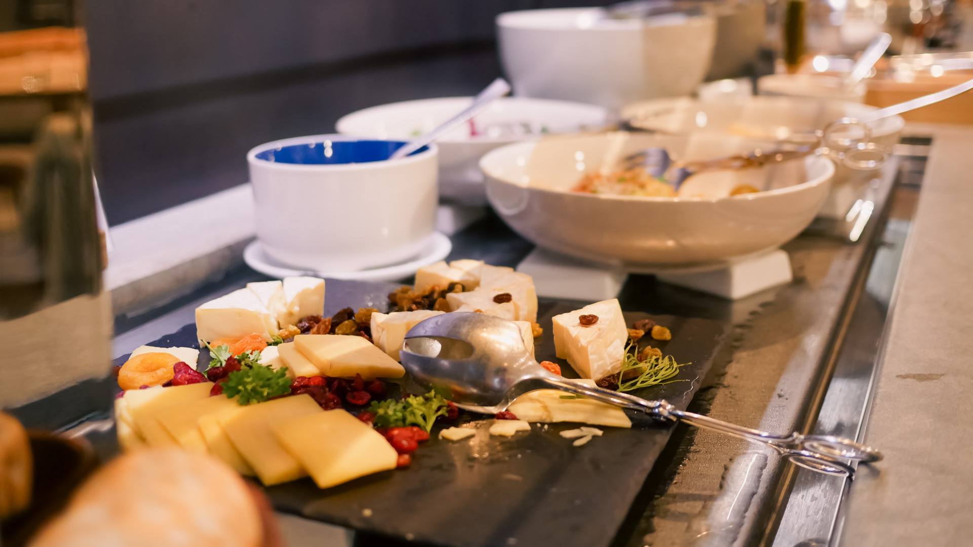 The cold buffet features a nice selection of cheese, crackers, nuts and fruit, as well as a couple of salads and quinoa.