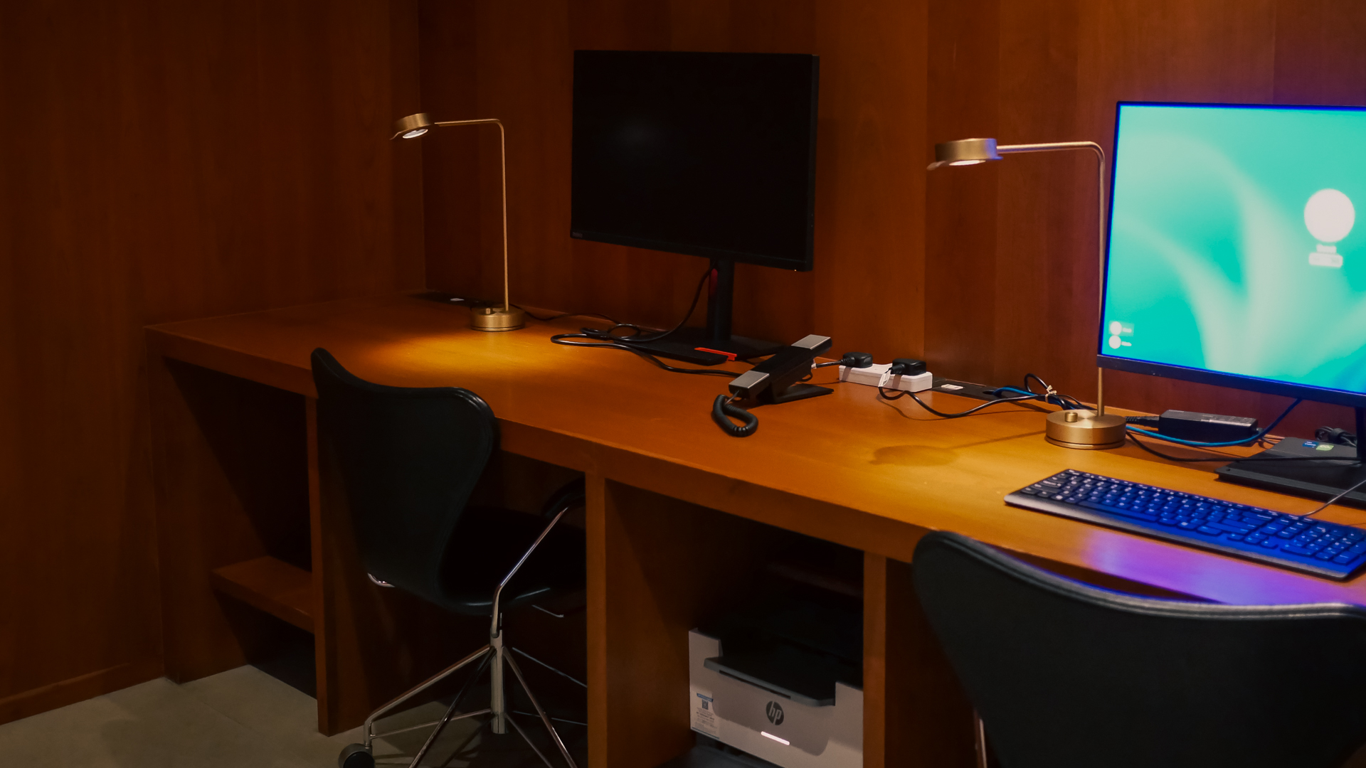 The bathrooms are immaculate and feel luxe, with the same wood panelling and gold accents found elsewhere in the lounge’s interior design. Just down the corridor is a dedicated business room Cathay has dubbed “The Bureau”. It features three workstations (one Mac, two PCs) and two printers.