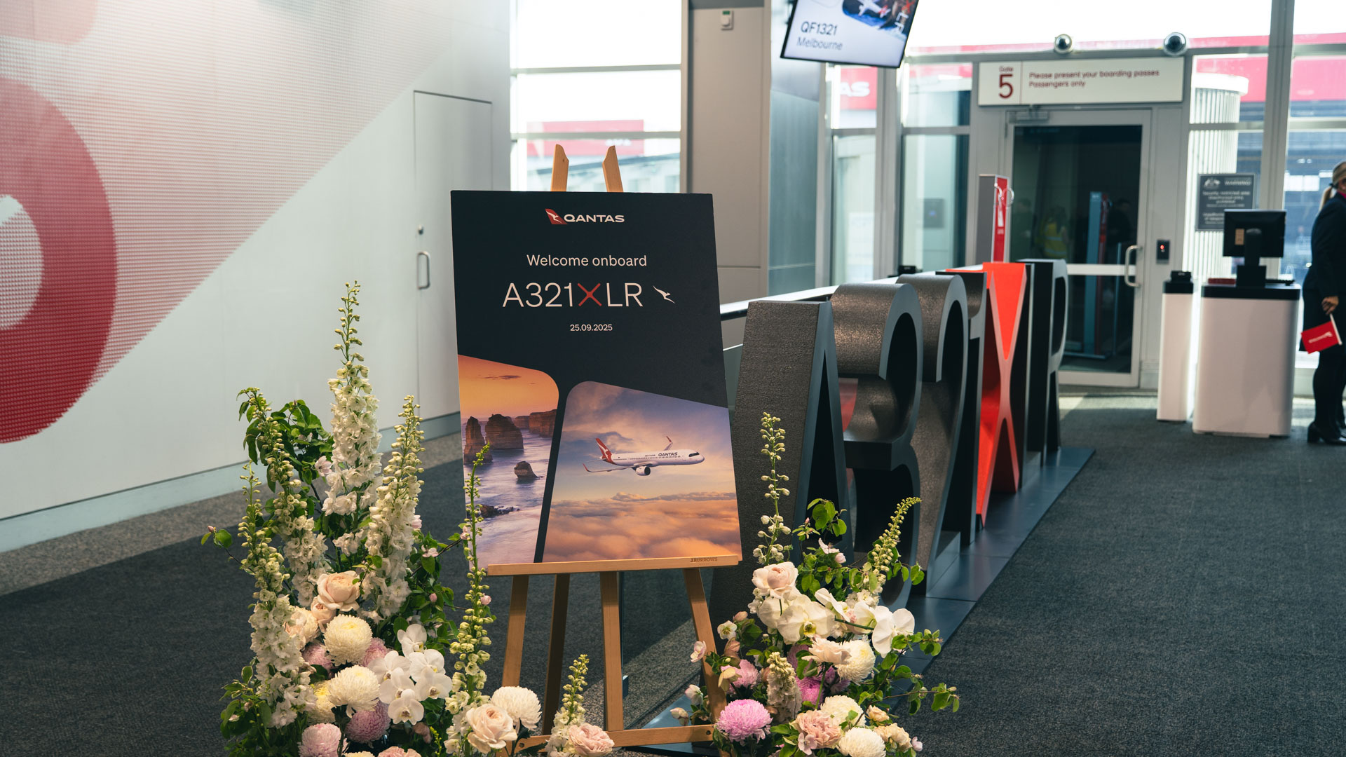 Over at Gate 5, festivities are in full swing with the roaming Qantas kangaroo, Matilda, entertaining audiences. There’s also special signage commemorating this first inaugural flight. I pre-board early to snap some pics of the cabin, but priority boarding is later enforced with the remaining Business Class passengers boarding in Group 1.