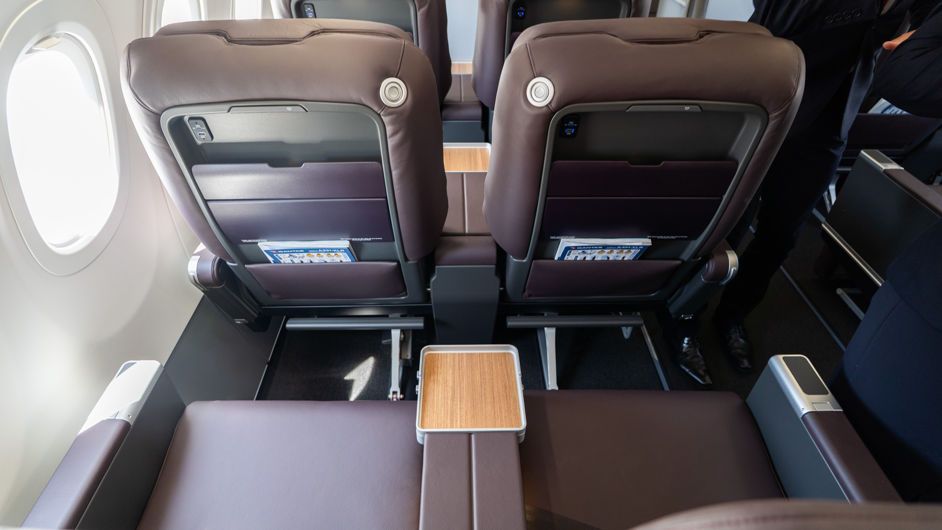 The ‘new plane’ smell is very much present – predominantly thanks to the new leather seats in Business Class. Arranged in a standard 2-2 layout, there are now five rows of recliners for a total of 20 Business Class seats.