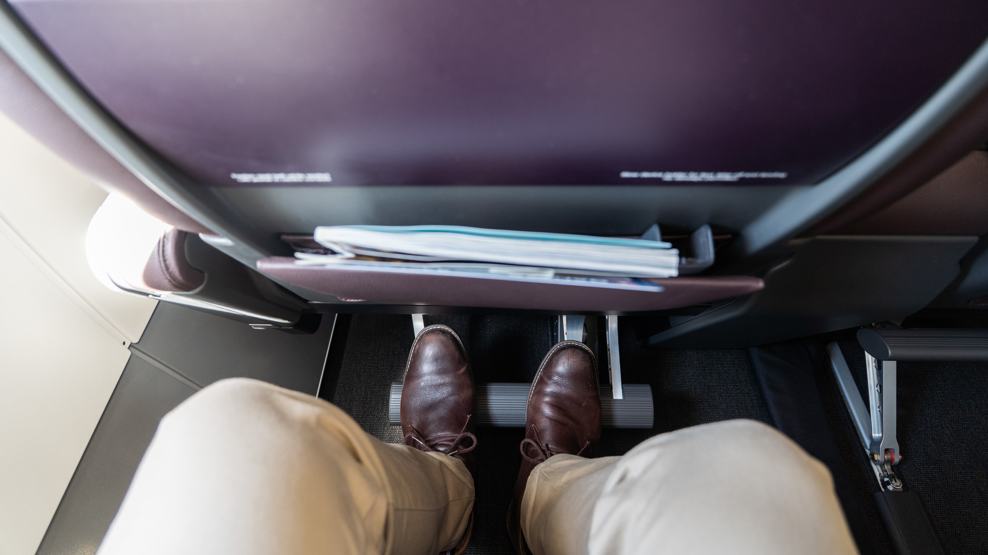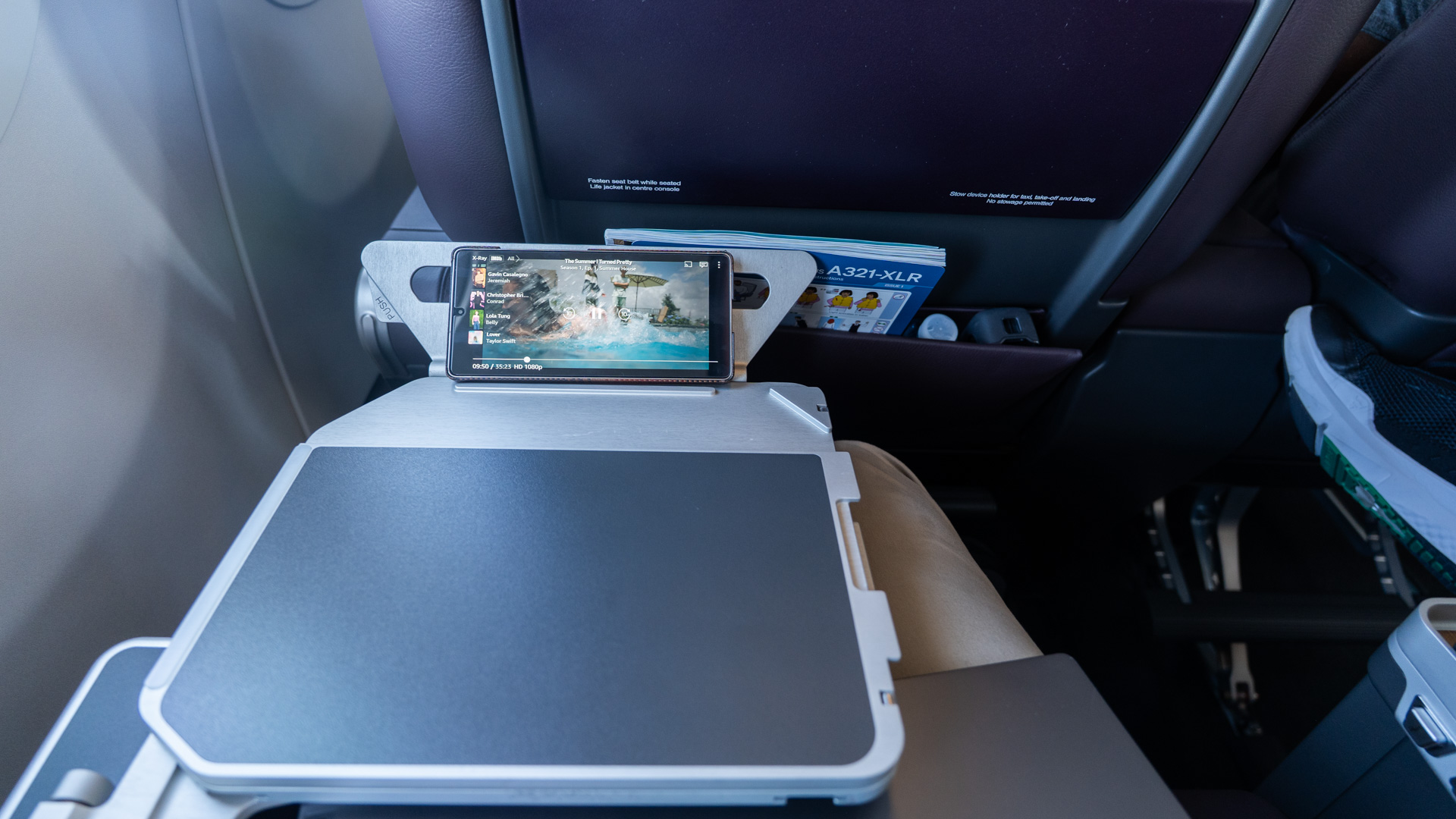 The tray table extends from the outer armrest and is pleasingly functional. In the half-folded state, it has a device holder that can swing out. When fully extended, it’s sturdy with very little bounce, whether you’re working or dining. It can also move forward or backward.