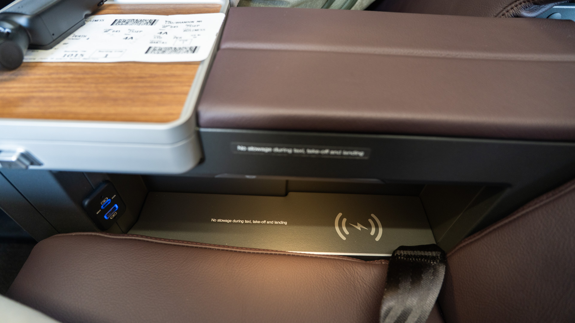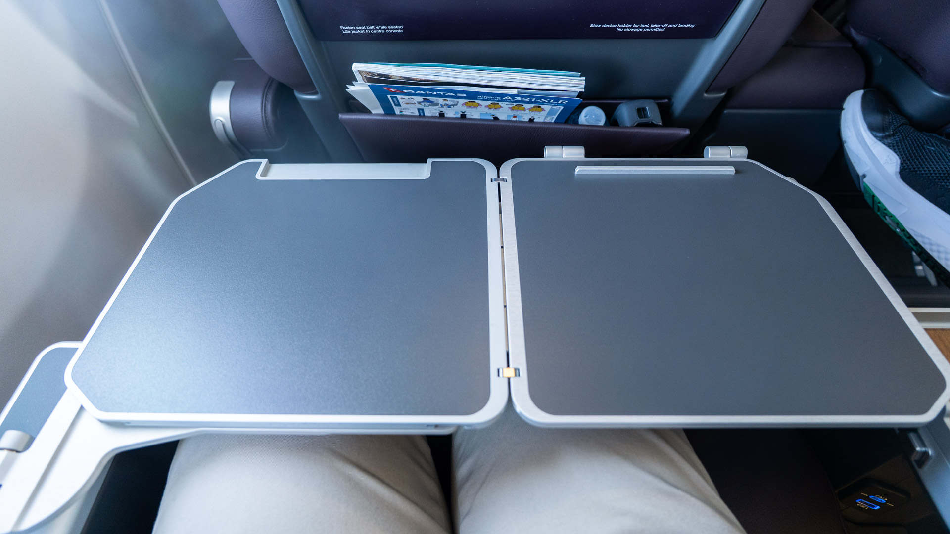 In the centre console, there’s a cut-out for more of your personal items, along with another set of USB ports (for a total of four per seat). Cleverly, Qantas has also incorporated a wireless charging pad here, which provides decent power output.