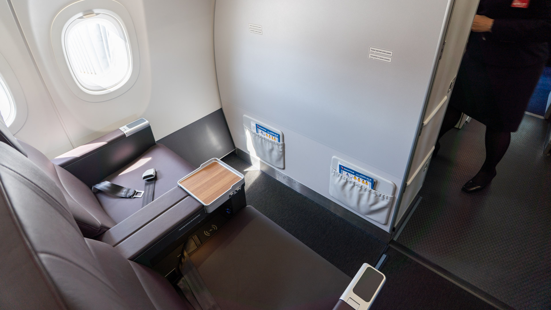 The centre cocktail table is wide and features a handy lip that stops your drink or phone from sliding around. Under the edge are two buttons, one to recline the seat. The other releases the swing-out footrest. As expected, my legs are too long to fully enjoy this feature, but other passengers may find it relaxing.