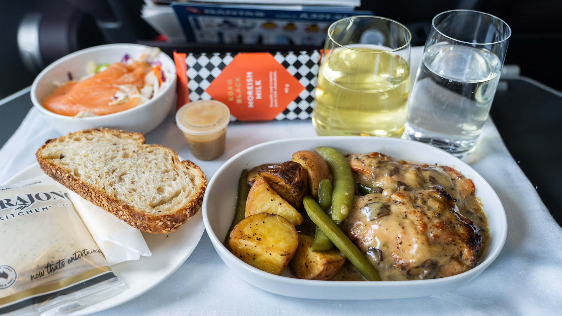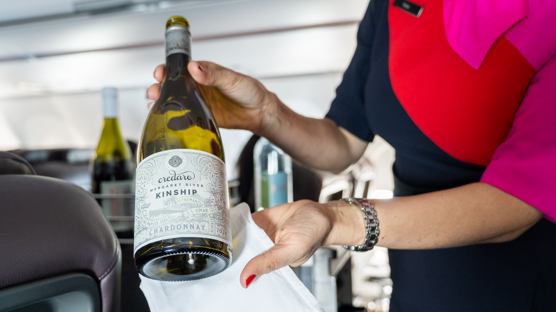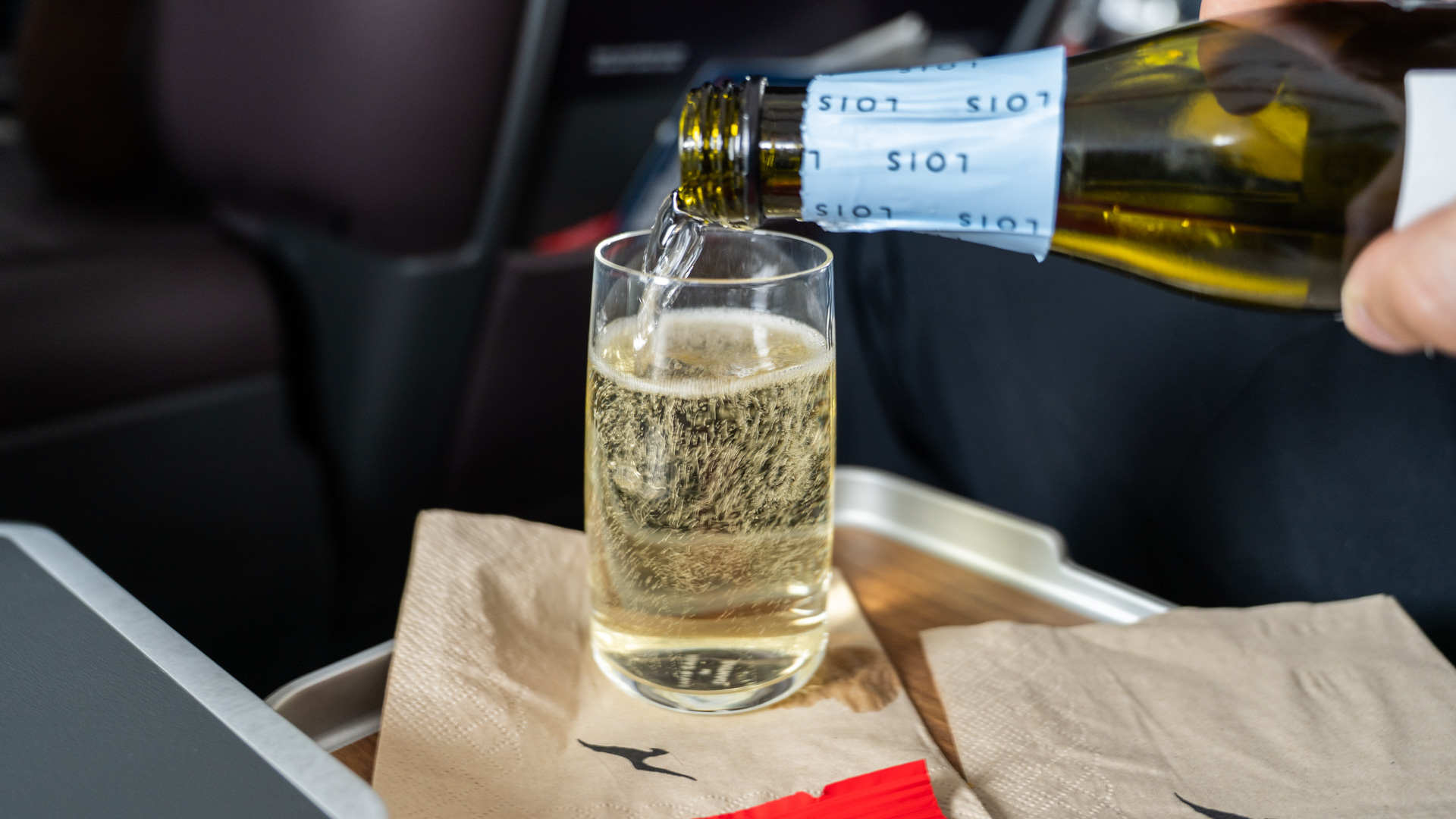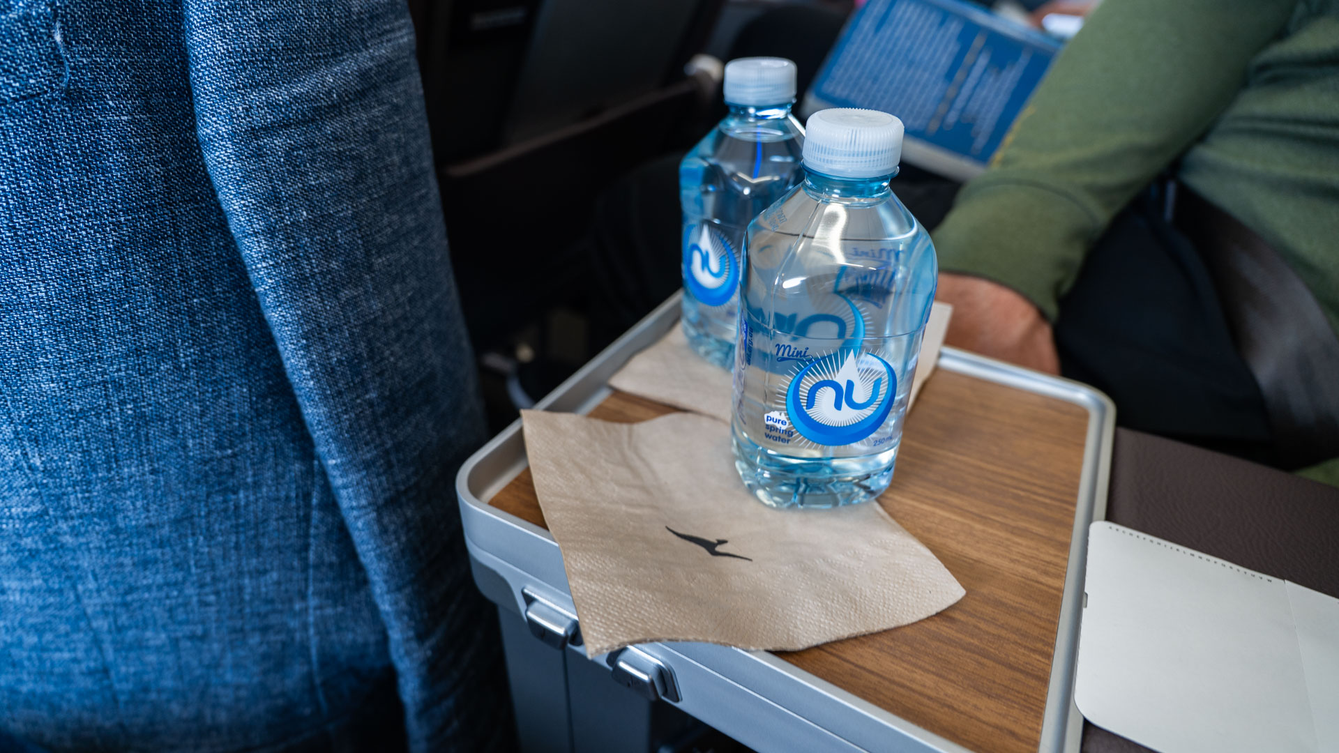 On this 4.5-hour domestic flight, lunch is served. Before take-off, the crew come around with bottles of water, followed by a drink of choice after take-off (I choose the sparkling wine). By comparison, Virgin Australia offers proper pre-departure drinks in domestic Business Class.