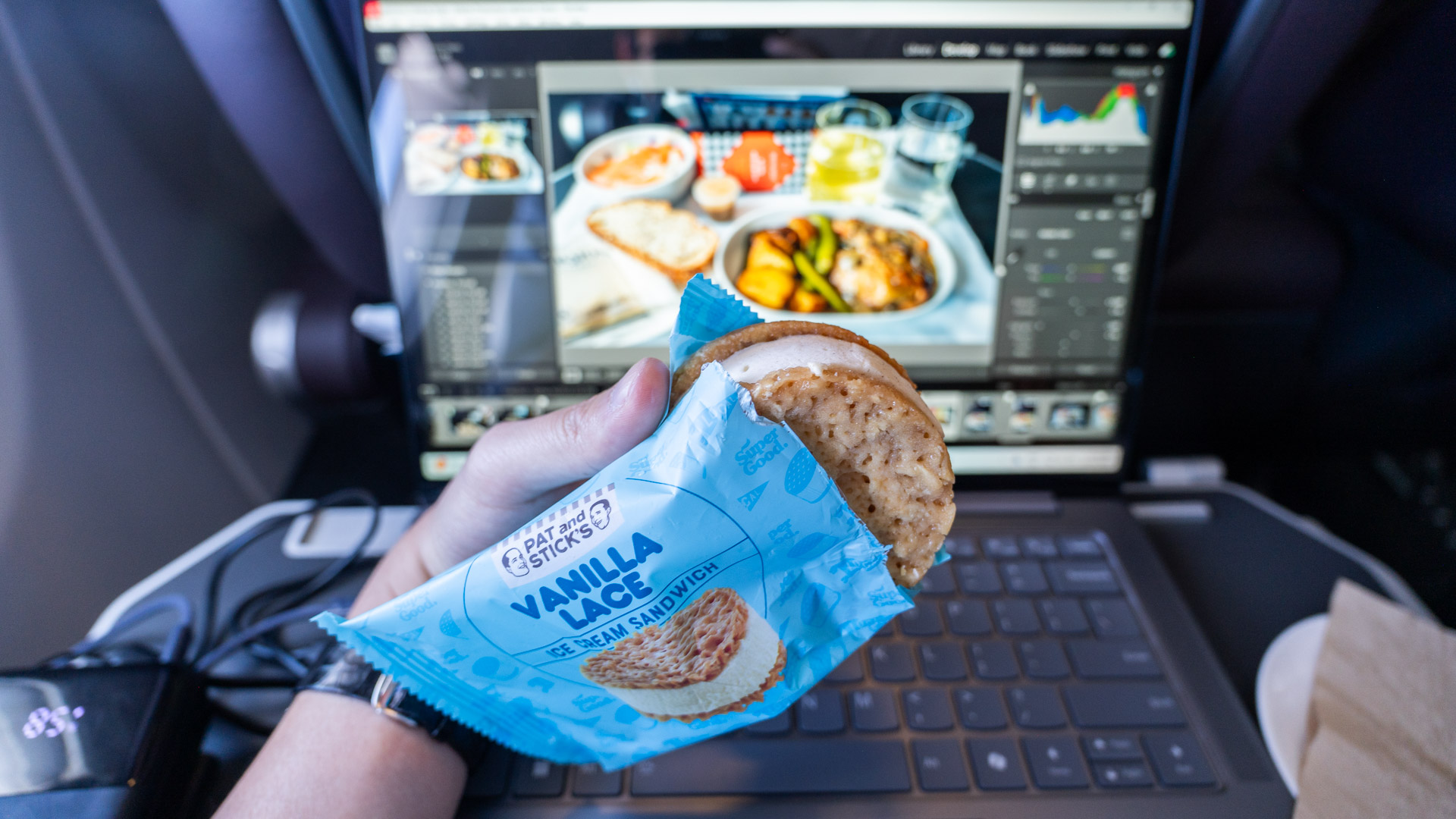 Later in the flight, we’re served a delicious Pat and Stick ice cream sandwich, which goes well with a hot peppermint tea. Overall, Qantas’ domestic Business Class offering is more than enough for the length of the flight.