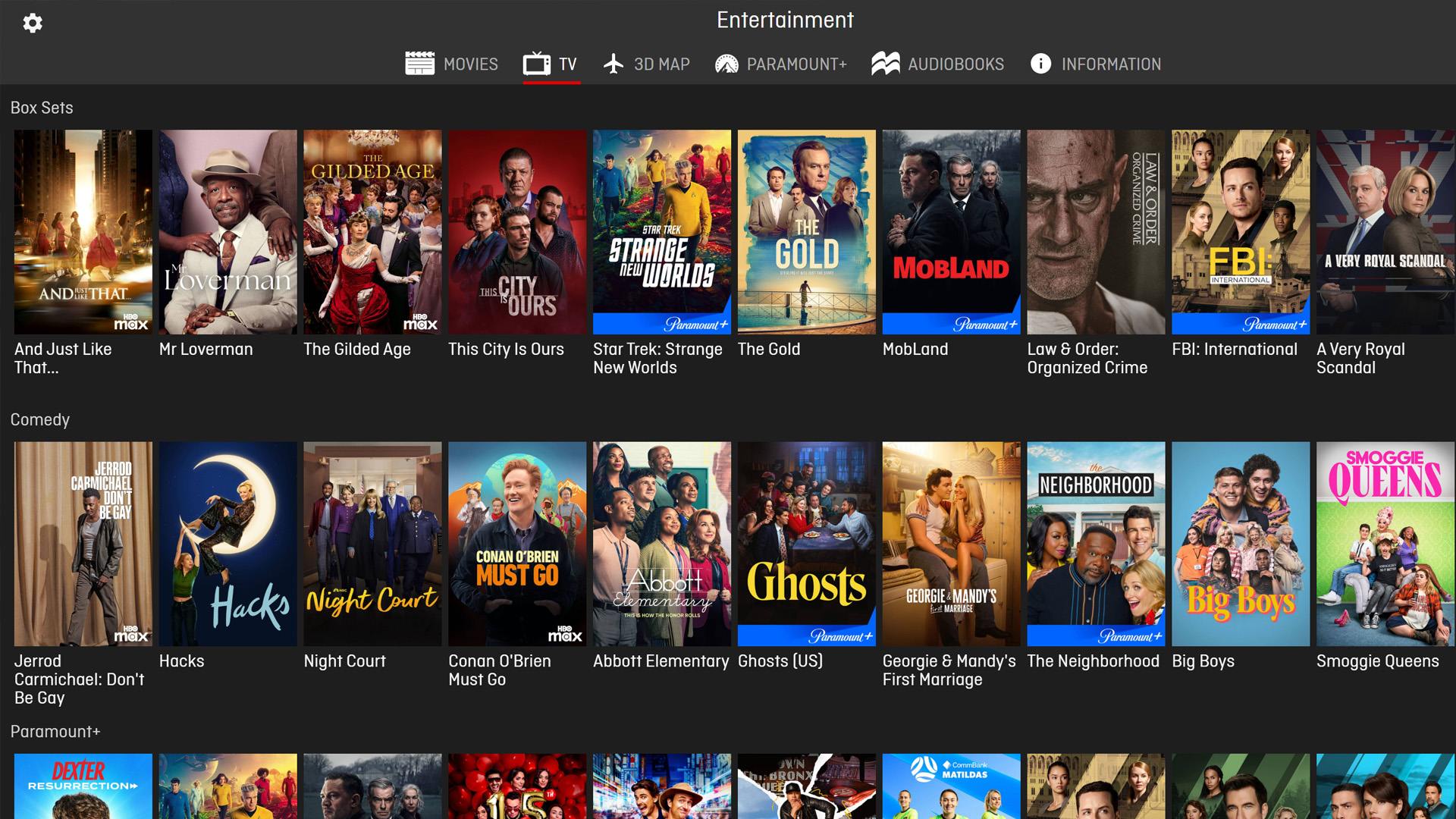 The TV series section is equally plentiful, with numerous listings, particularly Paramount+ offerings, that include full seasons. Finally, a range of audiobooks rounds out the selection. There are no onboard games or music albums. The 3D moving map is responsive and fun to swipe around to see where we are.