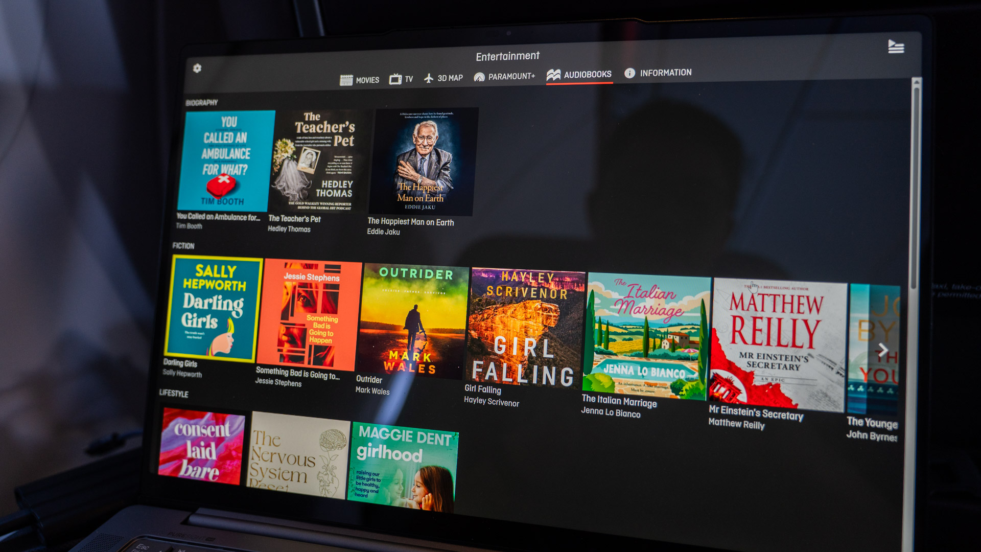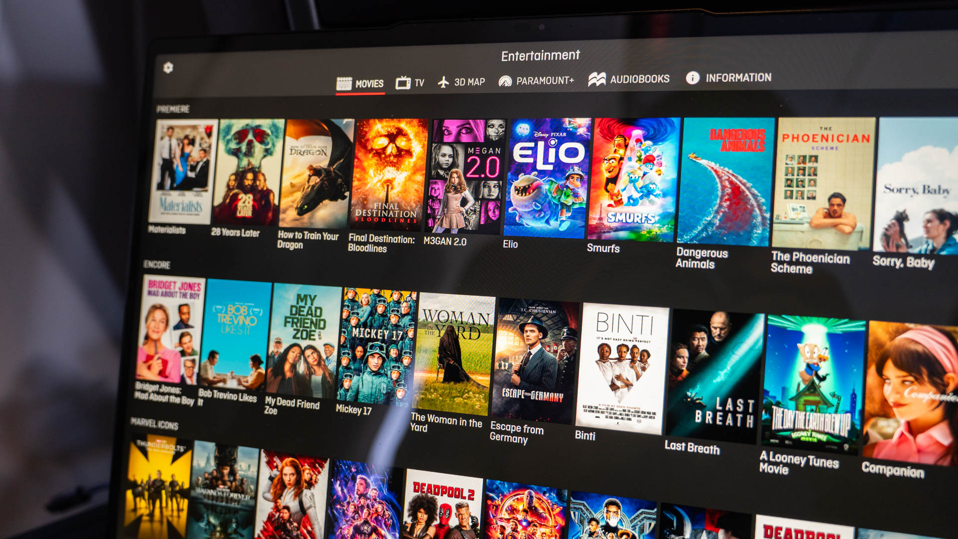 After the initial connection issues, the streaming entertainment system functions smoothly. There are over 60 movies to choose from, including recent releases such as 28 Years Later and Megan 2.0, plus classics such as the entire Harry Potter movie backlog.