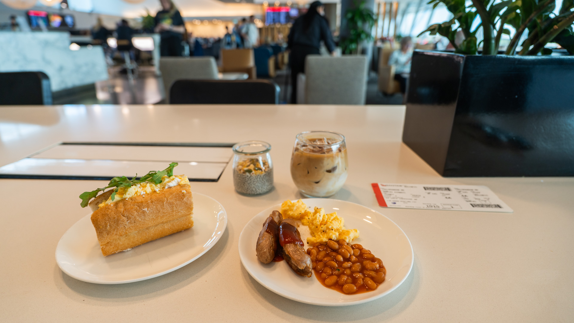 The Qantas Domestic Business Lounge in Sydney is the least impressive of the network in Australia. Breakfast is a standard affair, featuring chipolatas, scrambled eggs, and a delightful iced latte. A recent addition is the ‘Panini Bar’, where some freshly made rolls and slices await. I help myself to an egg and avocado roll.