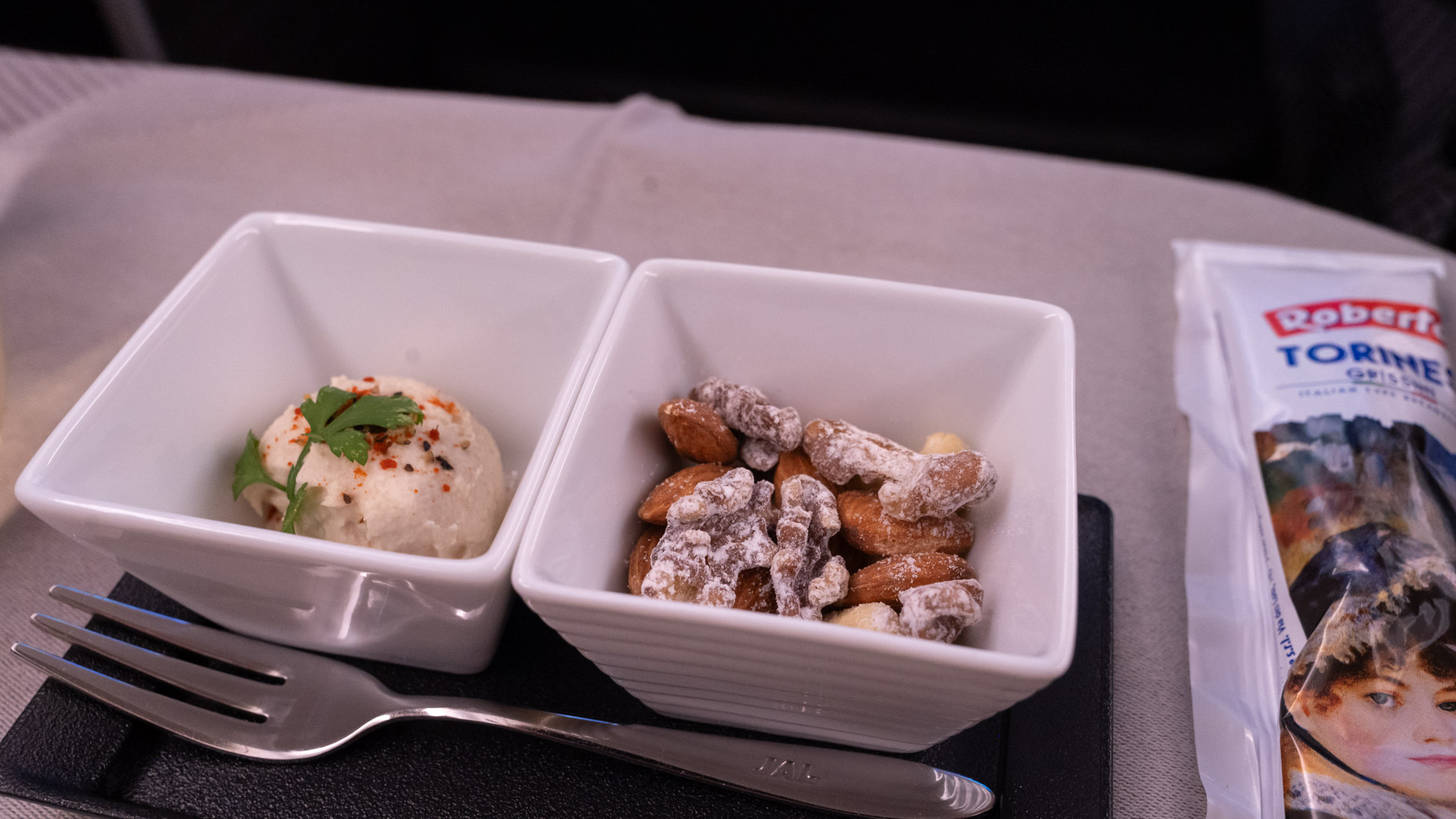 Before dinner kicks off, the crew come around with a full drinks service, this time served in proper glassware. Following that is a pair of amuse-bouche, such as some nuts.