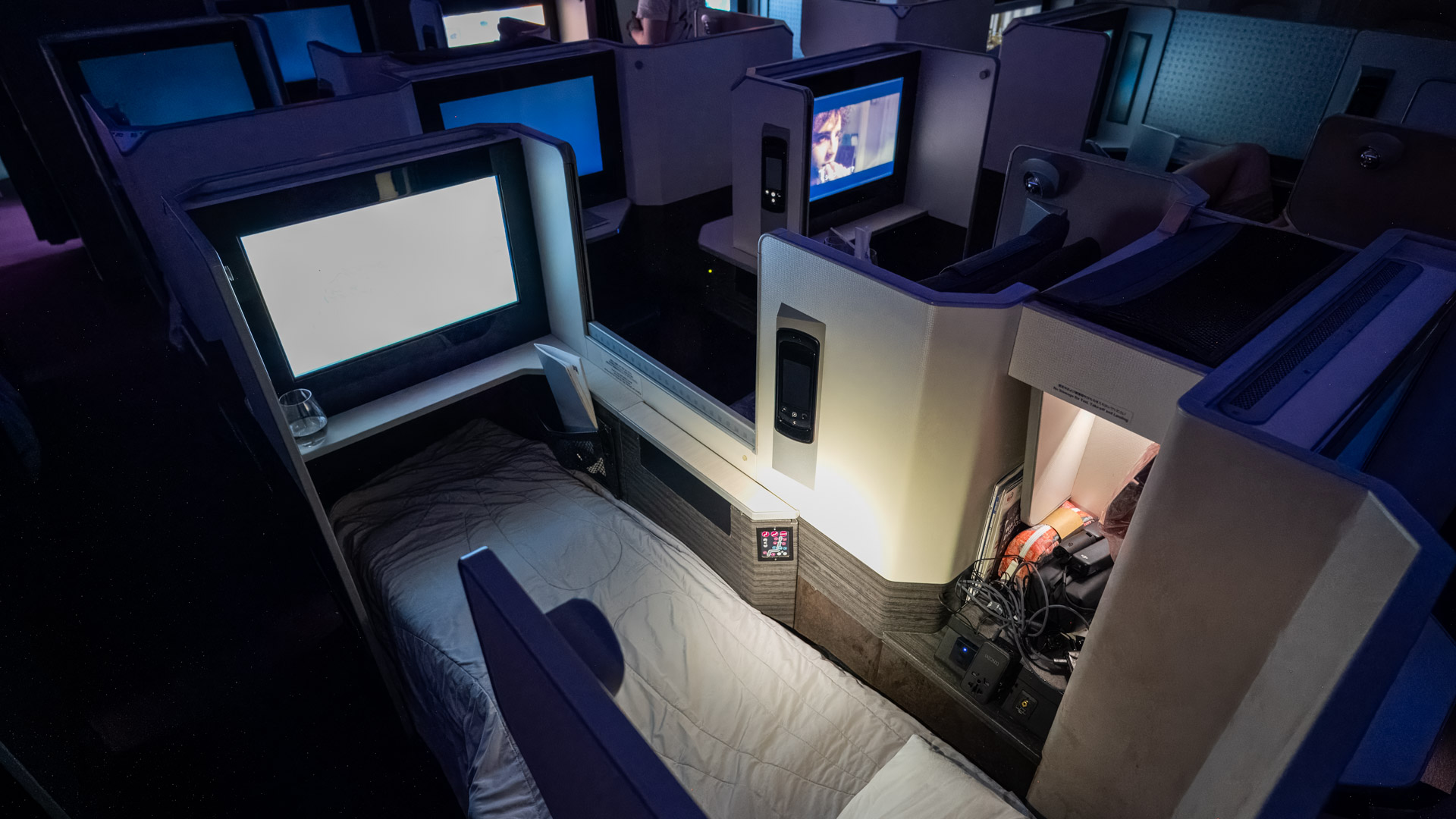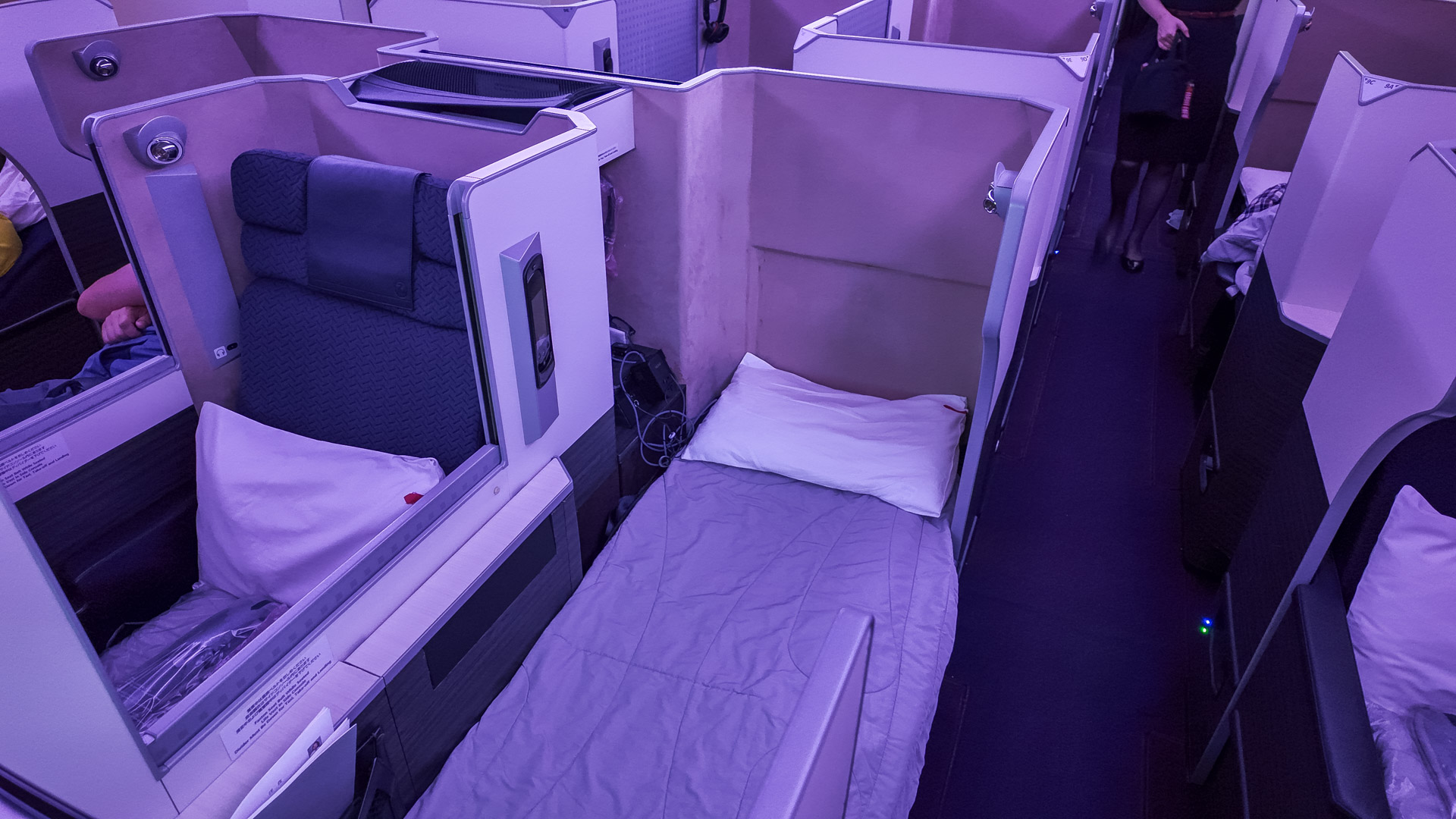 There are pros and cons to this configuration. The good: each seat offers plenty of space. Without the ‘dovetailing’ arrangement of typical Business Class seats, there are no cramped footwells and everyone has a full-length bed that almost feels like a First Class suite.