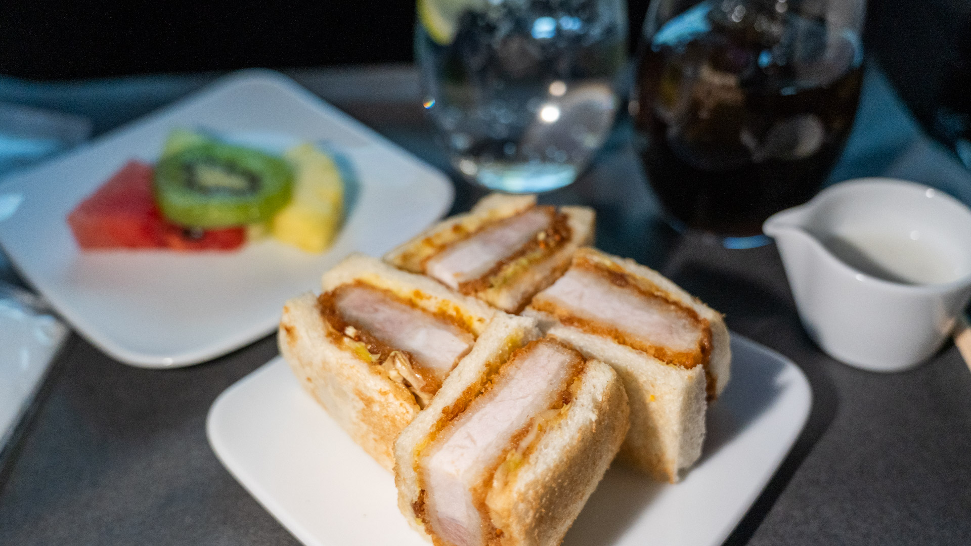 They’re surprisingly satisfying at altitude, especially when paired with the fresh fruit plate. The sandwich still retains a shadow of crunch, while the yuzu broth profile helps wake up my taste buds.