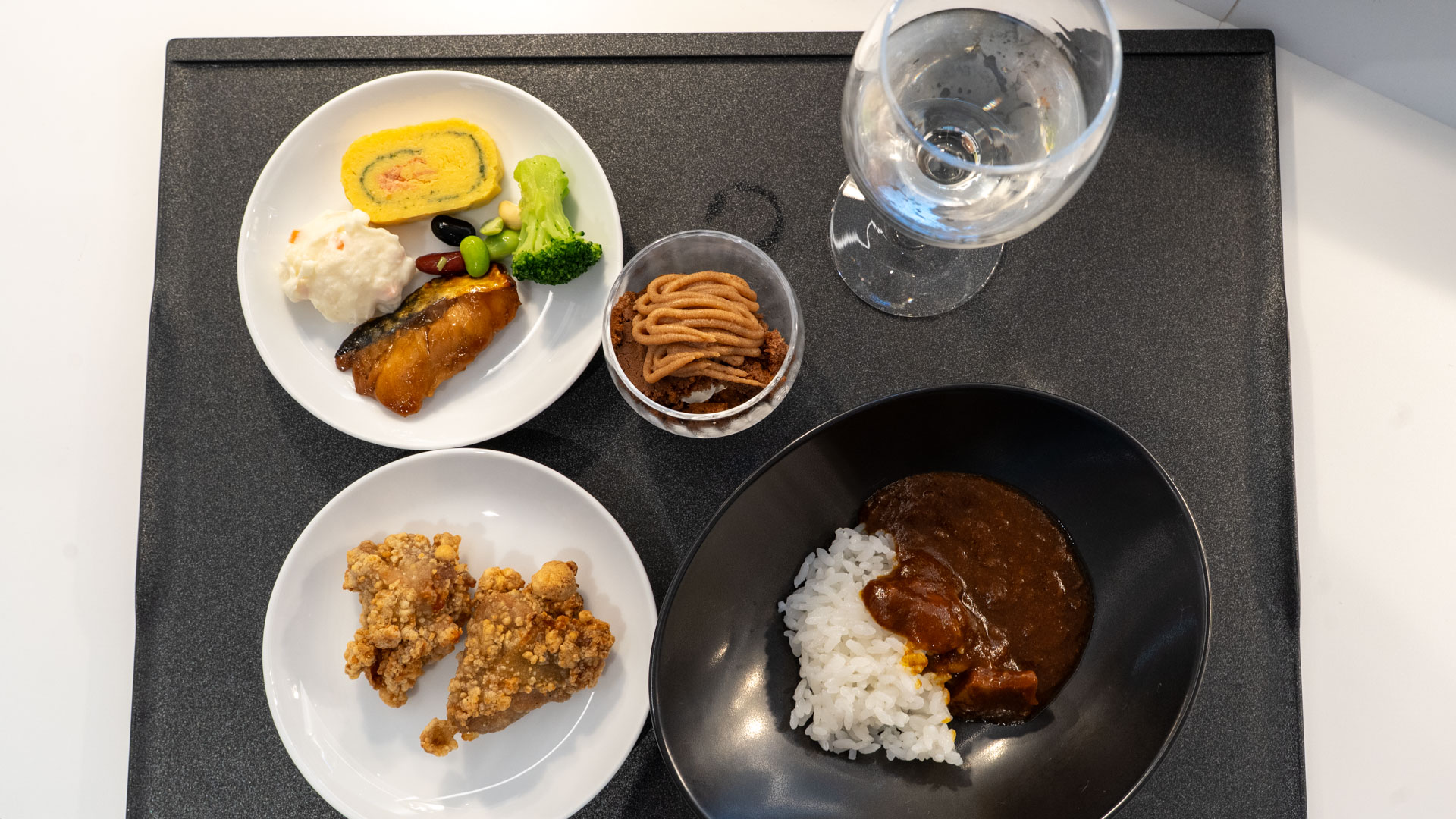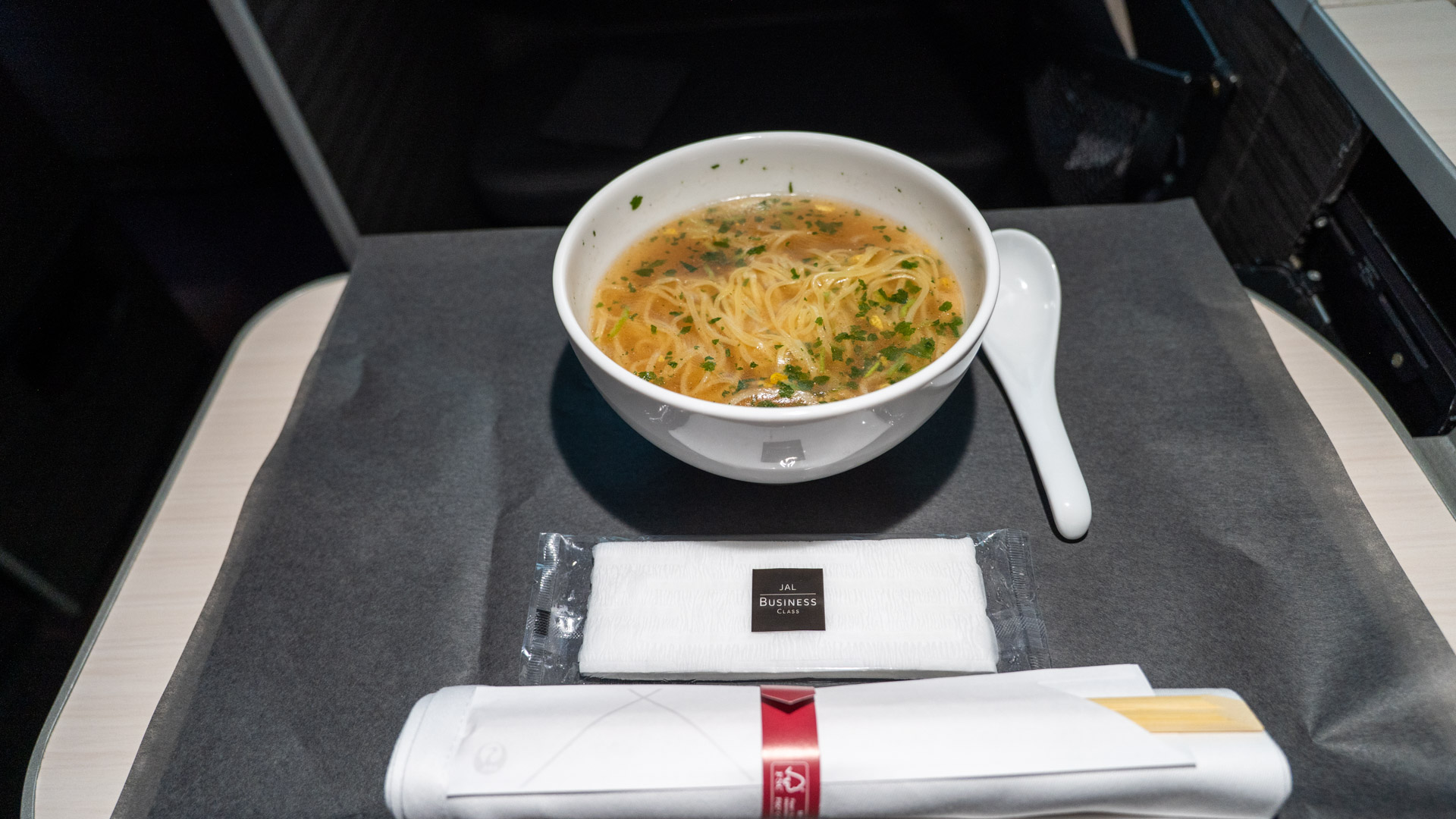 Mid-flight, I wake to try a selection of JAL’s snack options: ‘Sangenton’ pork cutlet sandwich and the Soranoiro-style yuzu ramen, both available on demand.