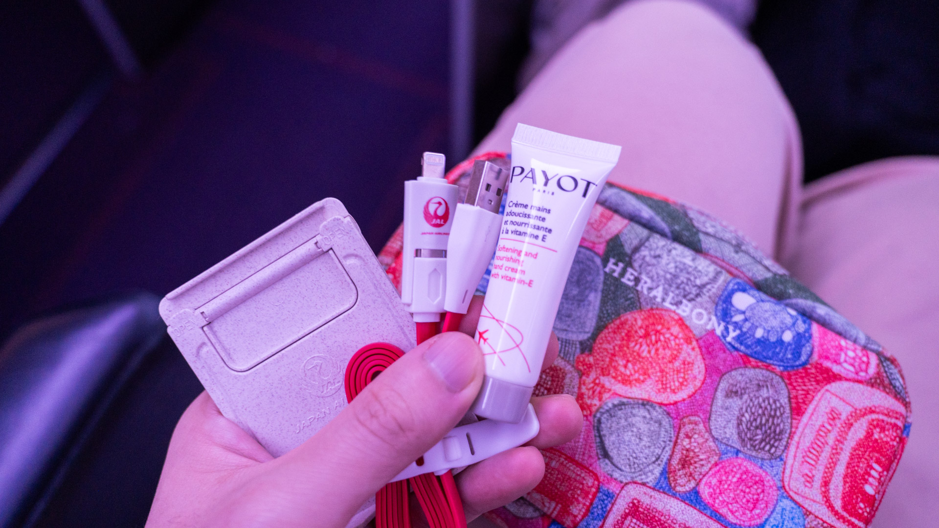 Trust Japan Airlines to do something a bit different. The amenity kit features Payot products, yes, but also a USB-C/Lightning to USB-A cable, which is quite a useful inclusion. There’s also a pop-up phone stand, which is a bit more on the quirky side.