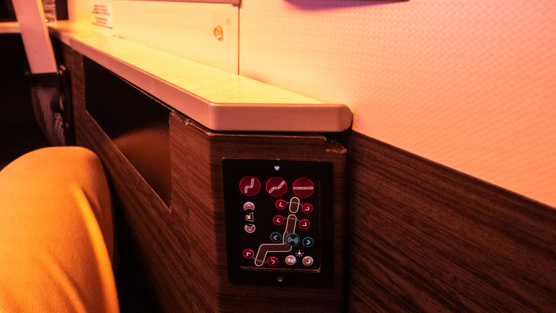 The not-so-good? With a denser layout like this, storage areas are limited. Aisle seats aren’t too bad, as there’s a little nook and cupboard that’s accessible. But the window seats don’t have the nook, so it’s harder to stash your gear within easy reach. Middle seats have a netted storage area above the headrest, which is a creative use of space, but not very practical. But all seats have ample storage under the ottoman – it could fit a carry-on bag!