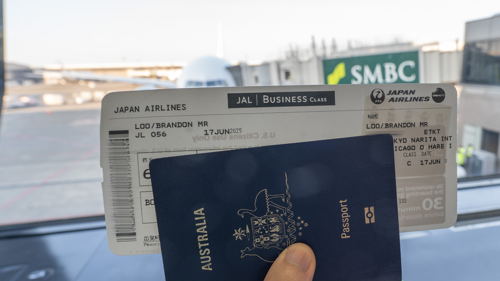 As part of USA pre-flight security checks, a friendly Japan Airlines ground agent roams the gate area, quizzing passengers about the purpose of their travel to the USA. I’m singled out as a solo traveller, but after answering a few brief questions, I get a stamp on the back of my boarding pass and am cleared to board.