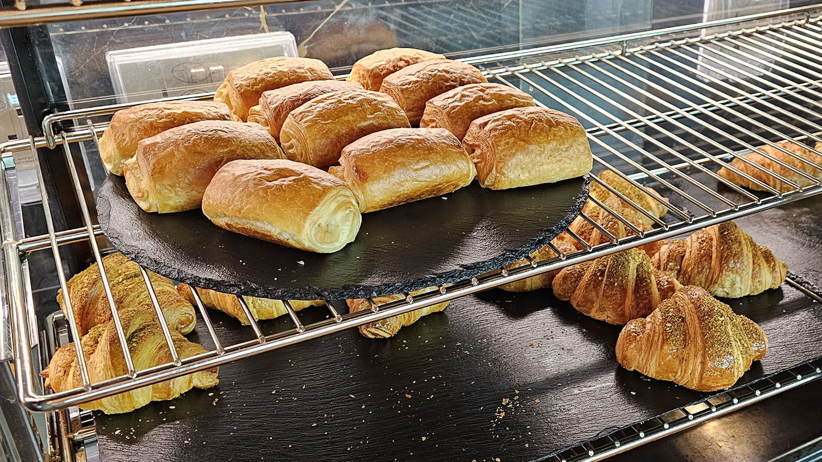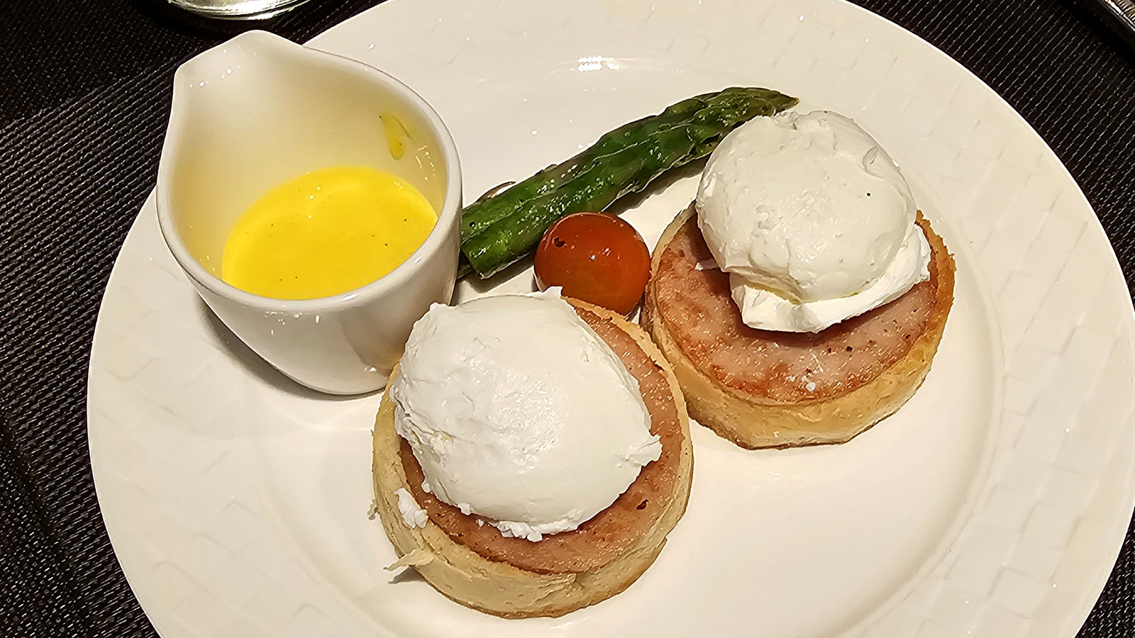 I assemble a small tasting plate to try various things, and I’m not disappointed. But I’ve saved my appetite for the à la carte service. After a few days of sampling local favourites and Middle Eastern signatures, a simple Eggs Benedict with (turkey) bacon hits the spot. The barista-made latte is also up to scratch.