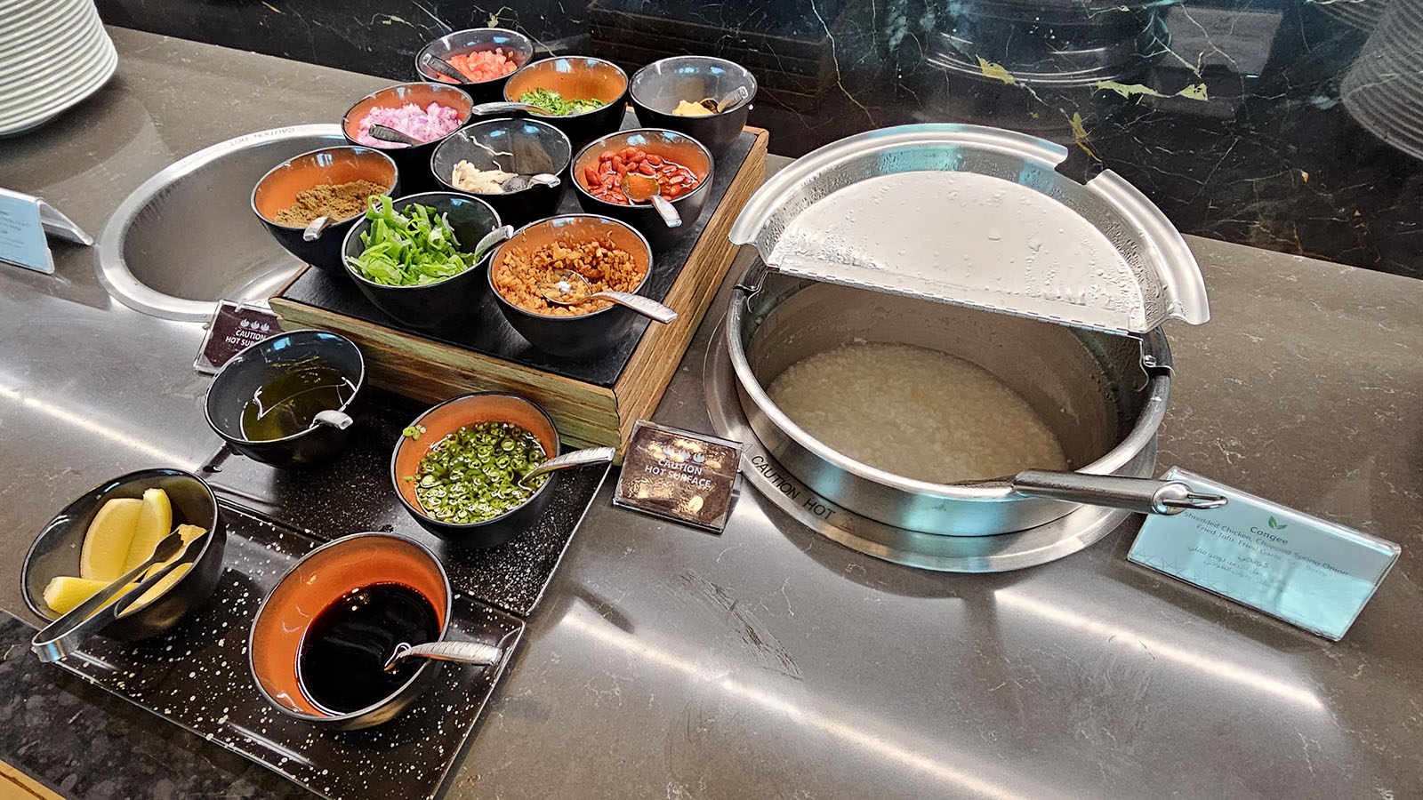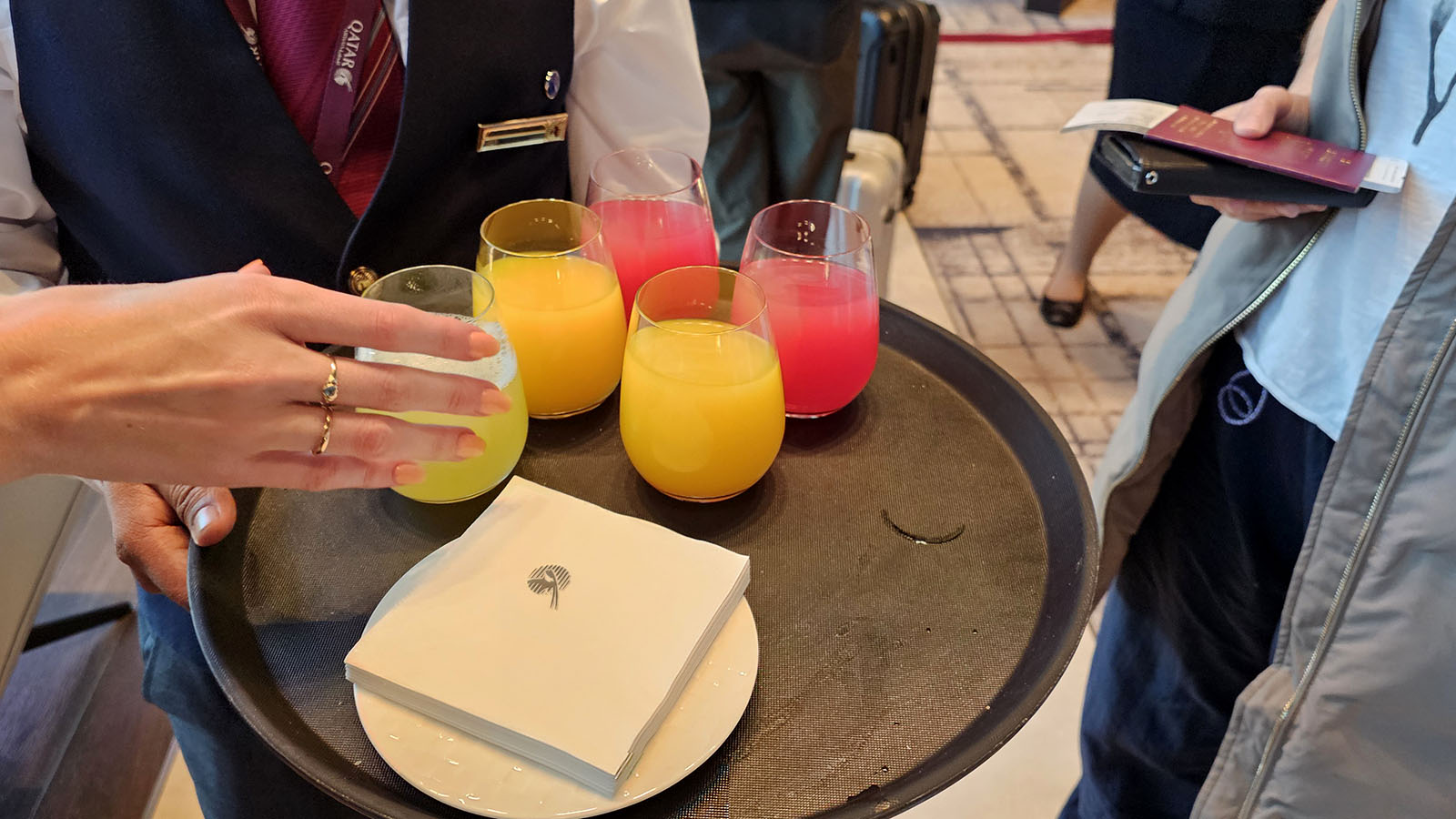 Having said that, there’s a bit of a queue to access the dining area. Given the size of this lounge, that shouldn’t have been the case as there’d be more than enough room to include enough tables for all. Staff offer juices to guests waiting in line. Hopefully none had tight connections.