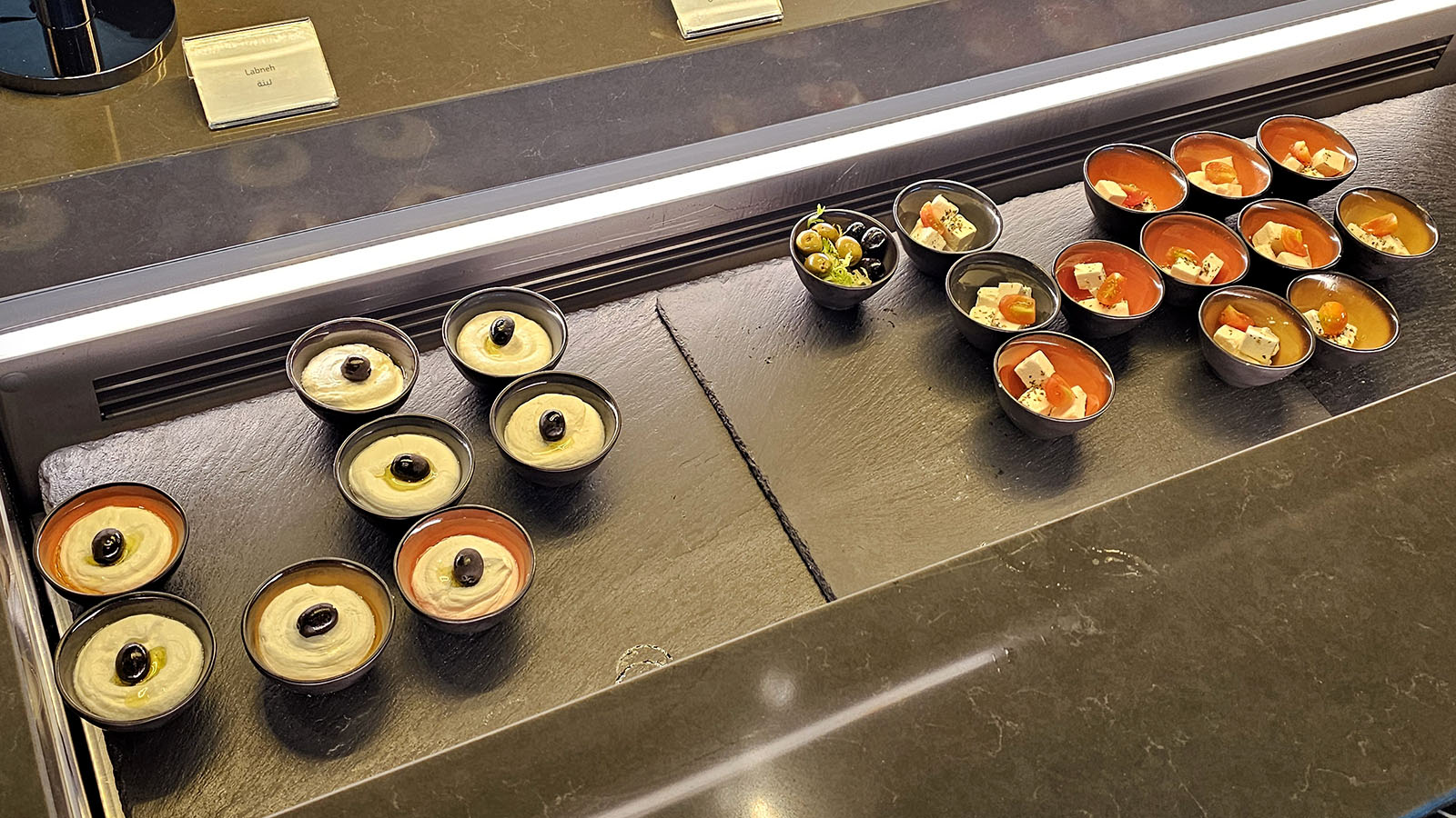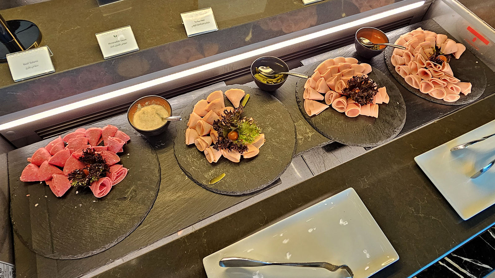 There’s a broad range of food on offer in the Al Mourjan lounges, including in The Garden. Champagne, wine and other alcohol can be enjoyed 24/7 – reflecting that the lounge’s many guests will be on different time zones. Today’s morning visit finds a well-stocked buffet spread of hot options and chilled bites.