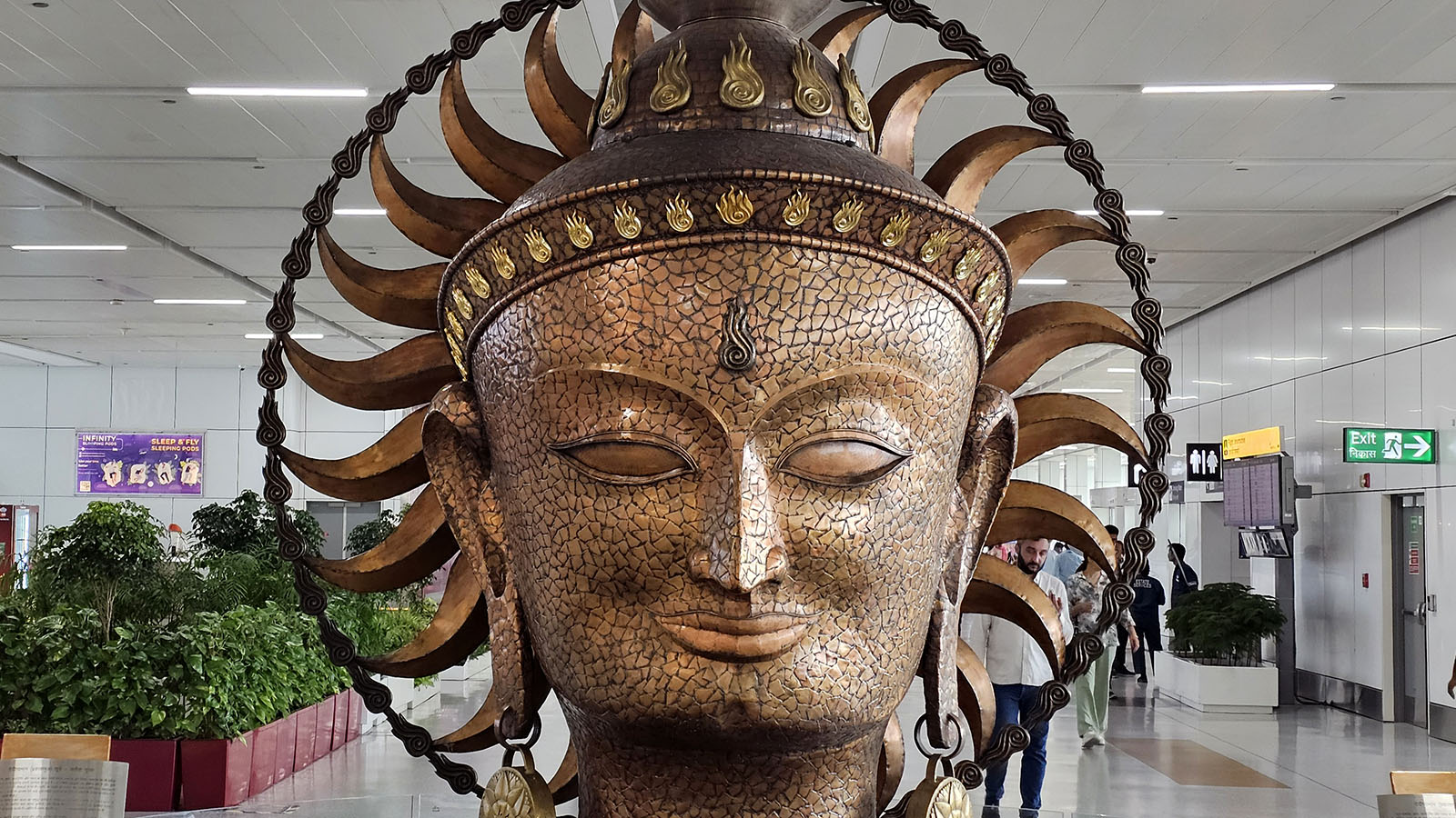 There are no boarding announcements in the lounge, so I make my way to the gate for the scheduled boarding time. The flight is a tiny bit behind schedule, which gives me a moment to explore some of the sculptures along the departure concourse. There’s a particularly striking face with hair styled to look like an aircraft engine. Then, ding, it’s time to depart. Priority boarding gets me straight onto SriLankan’s Airbus A320.