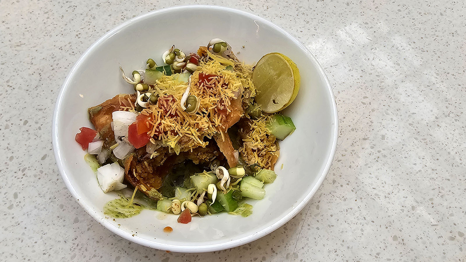 On the side, there’s a choice of bread. When there’s garlic bread and it’s still warm, that’s always my pick. On the side, a salad and a dessert of gulab jamun on a bed of rabri complete the meal. Translation: yum!