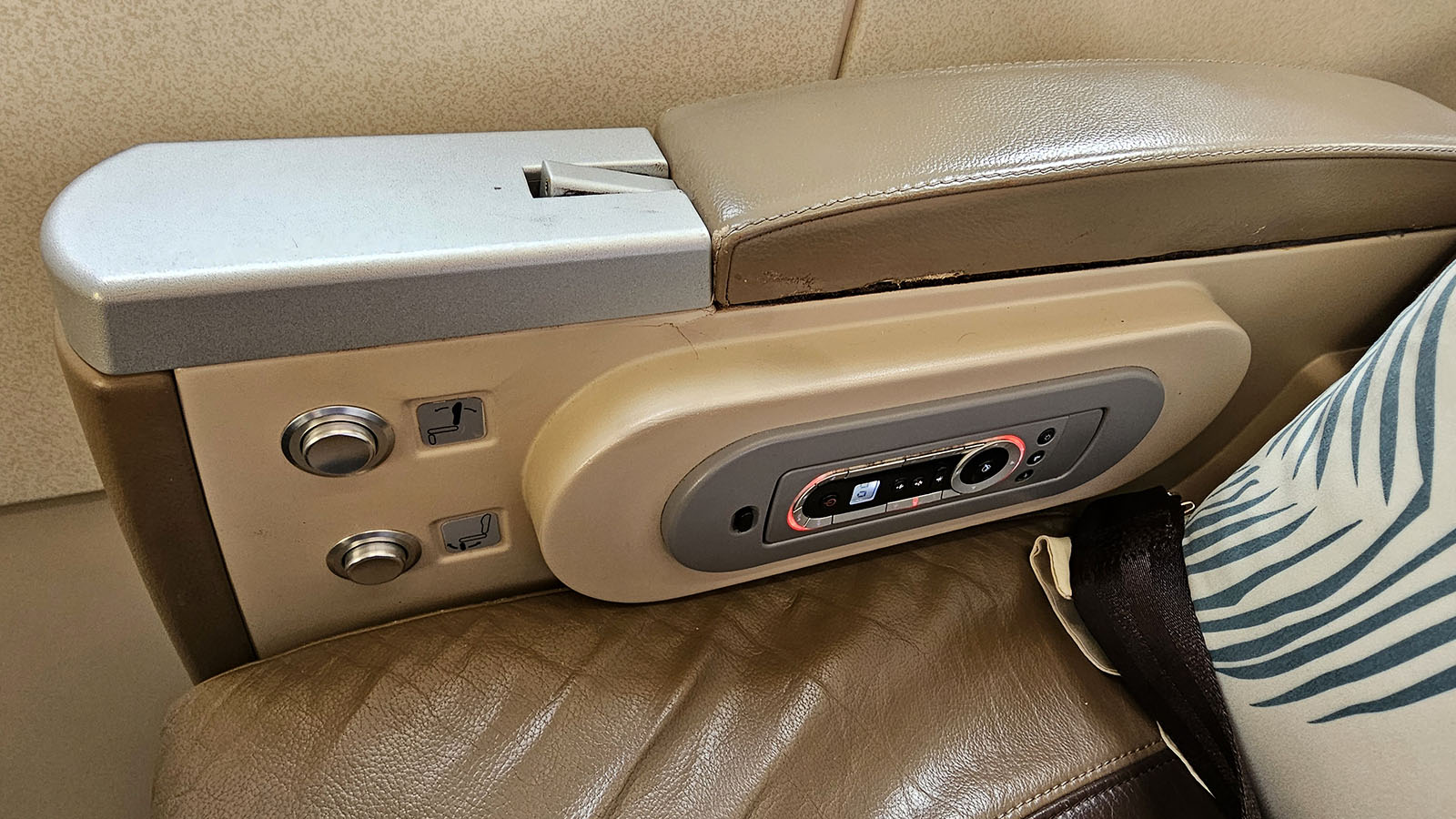 The style of the seat is a little bit old. The remote control, for instance, looks like a car stereo from years gone by. The seat controls are basic, with a standard round button for recline, and the same for the leg rest. But, you know what? This is a 3.5-hour daytime flight, where I can put my feet up, kick back, and settle in. I really don’t need a bed, and having a leg rest is more than I can say of some other short-haul Business Class seats.