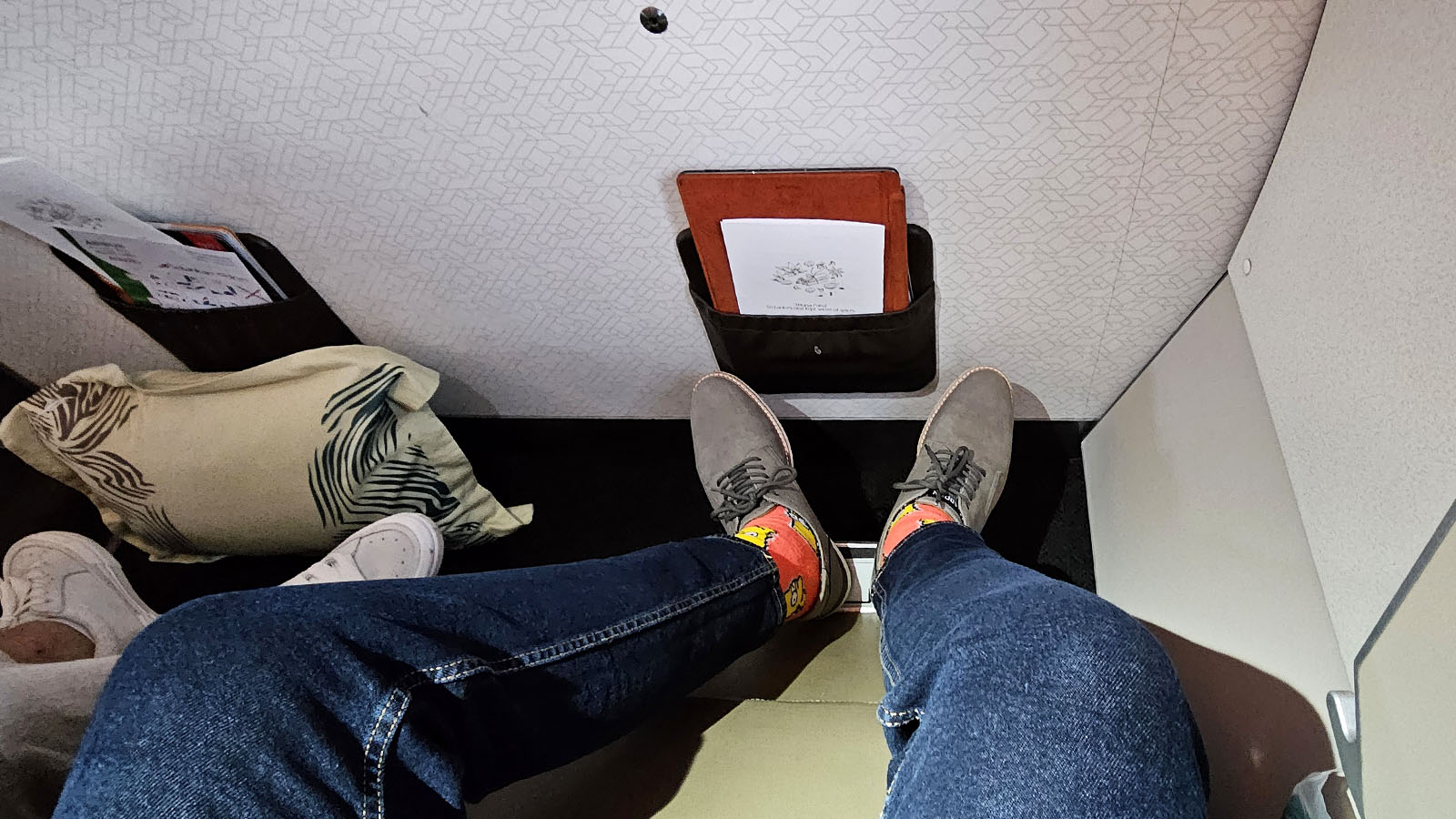 I’m not seated with my industry colleague – being on the same flight was merely by chance – so I mainly spend the journey getting work done. There’s no inflight internet, but I’ve come prepared. I take the opportunity to explore the entertainment selections during mealtime. The provided headphones are of average quality, so I connect my own noise-cancelling cans instead.