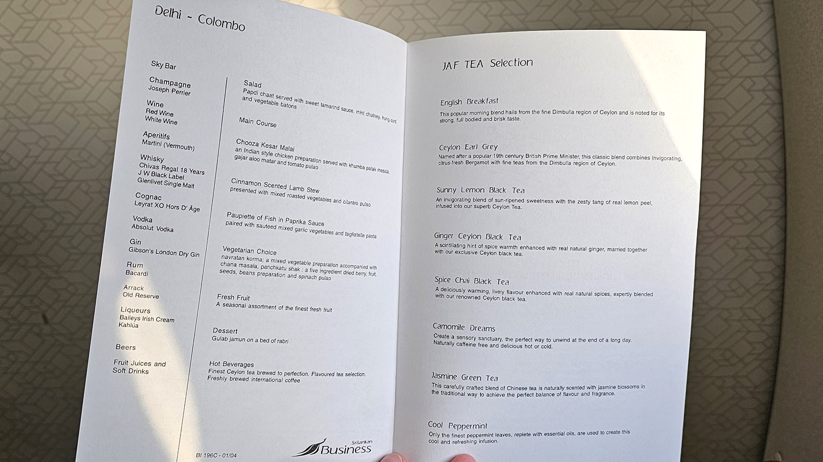 Food and beverage in SriLankan Airlines Airbus A320 Business Class